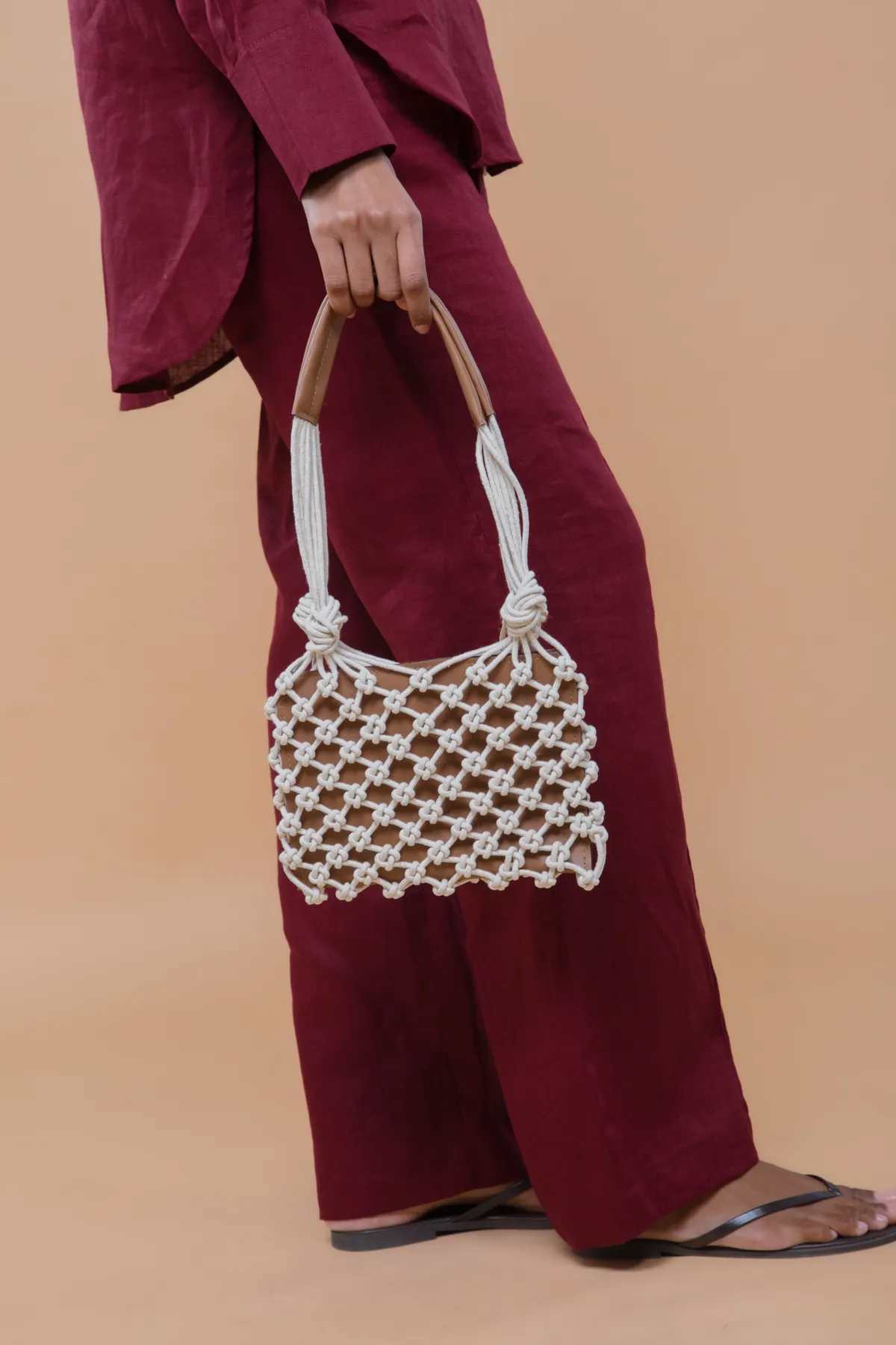 Bolsa de macramê, feita com fio de algodão, com detalhe nas alças e bag interna em couro vegano. A bag interna possui fecho de imã.