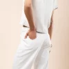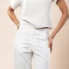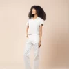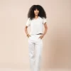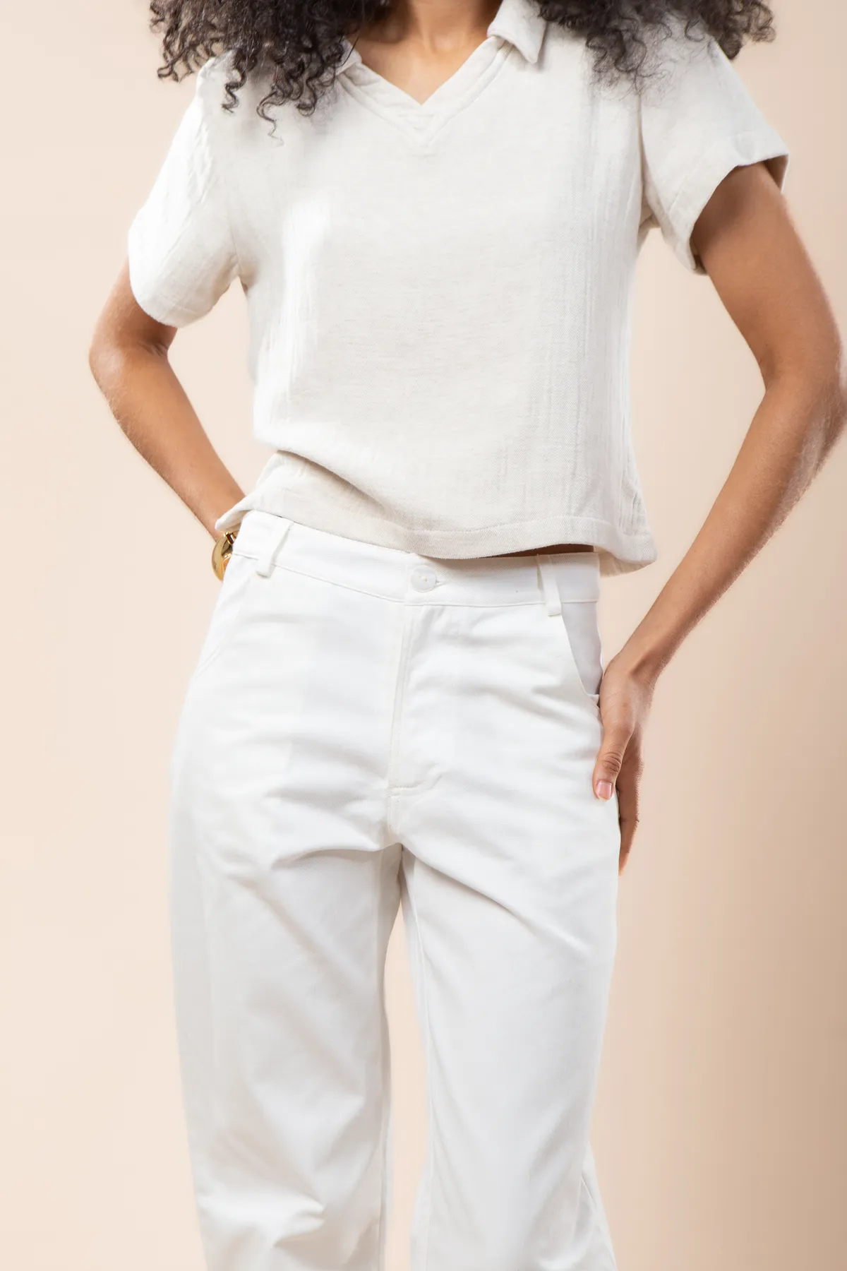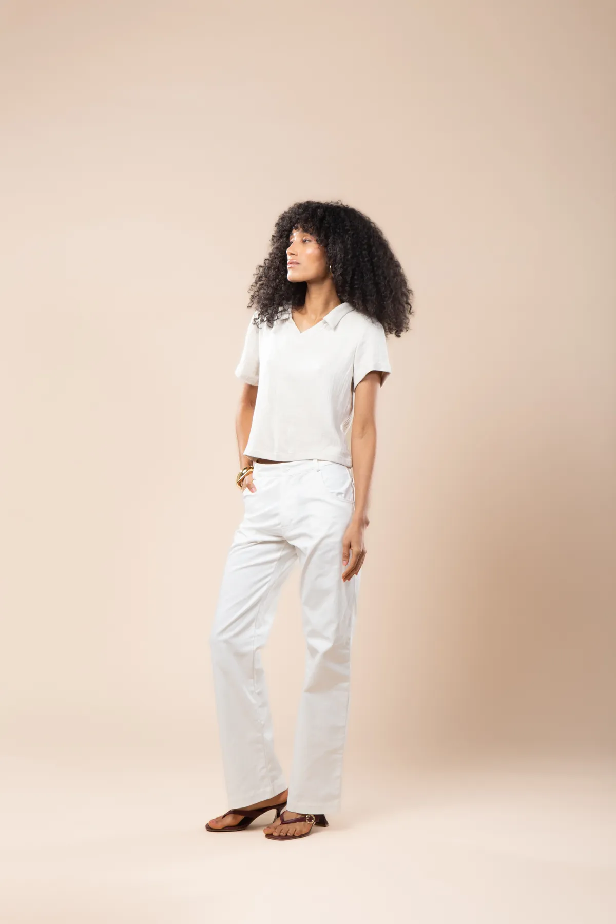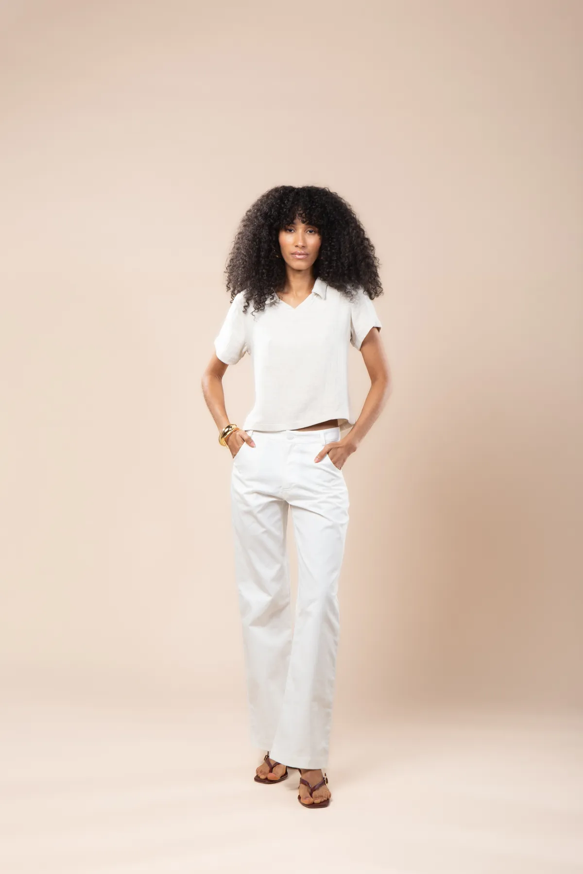 A Calça Catarina é feita em sarja de algodão encorpado. Modelagem reta, ampla, cintura média. Peça atemporal e versátil. Possui dois bolsos na frente, e dois bolsos de trás em formato assimétrico inspirados nos movimentos naturais. Possui passante para cinto. Fechamento em zíper e botão madrepérola.