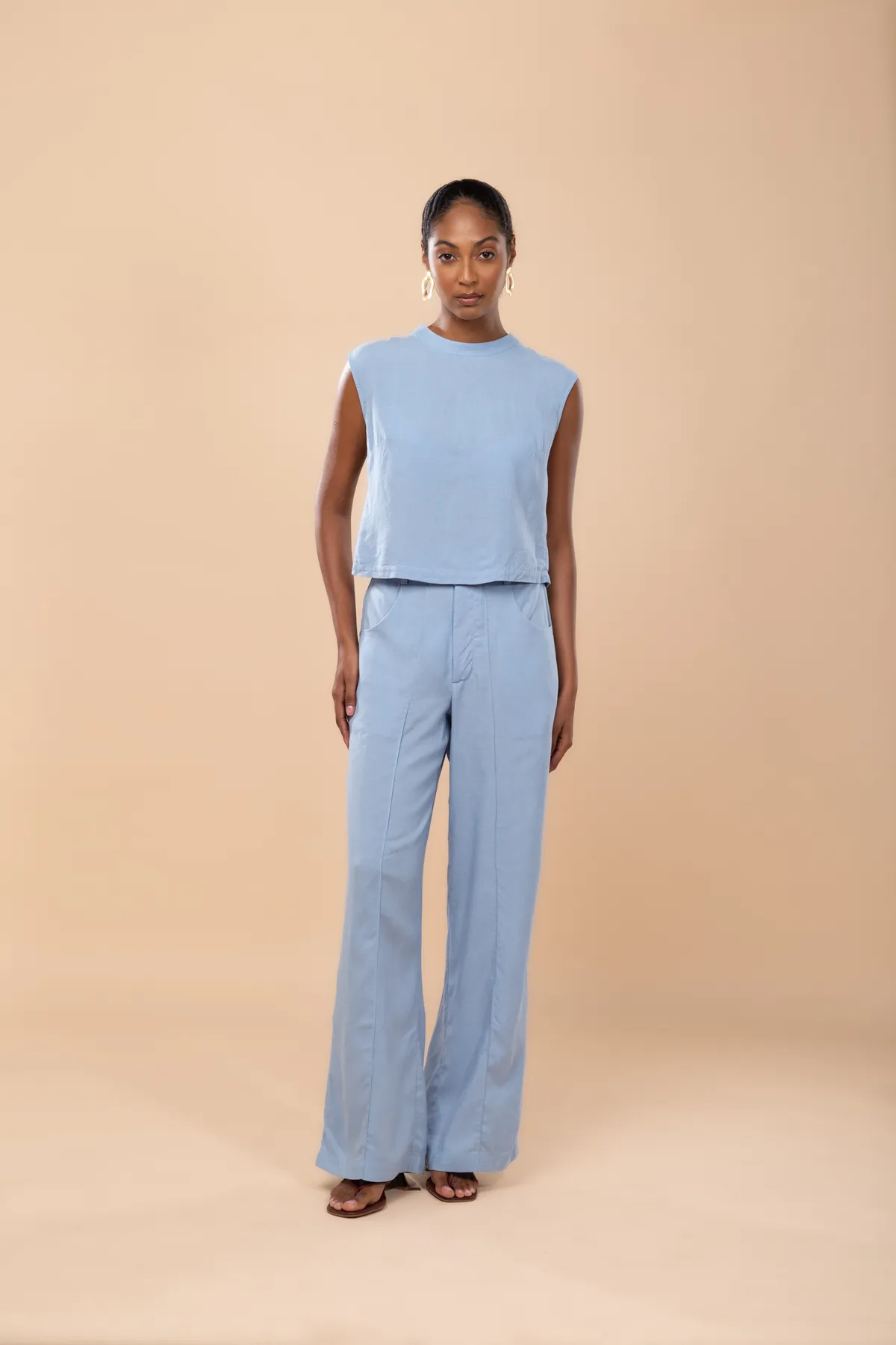 A Calça Lívia inspira uma alfaiataria tropical feita em linho puro, com design moderno e que prioriza conforto. Modelagem reta e cintura alta. Possui passante para cinto e dois bolsos. Fechamento frontal por dois botões madrepérola e zíper.