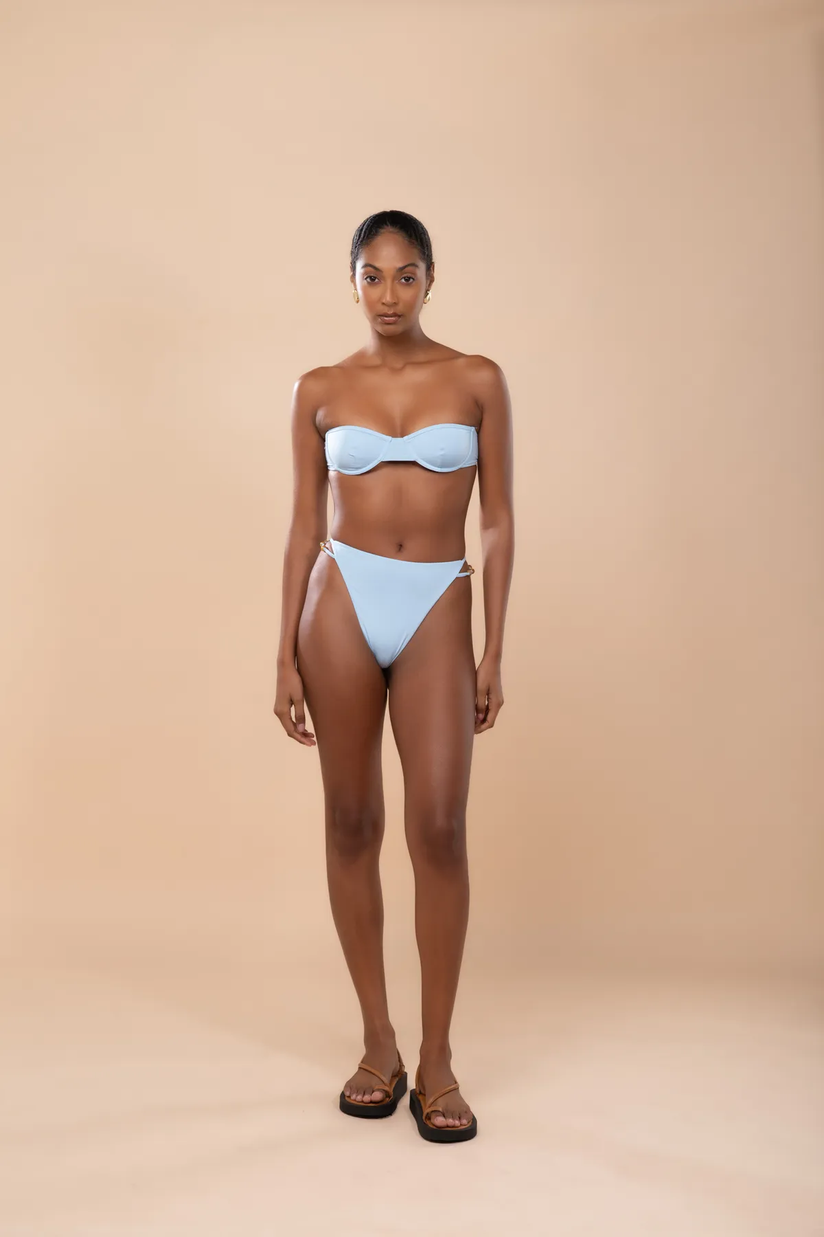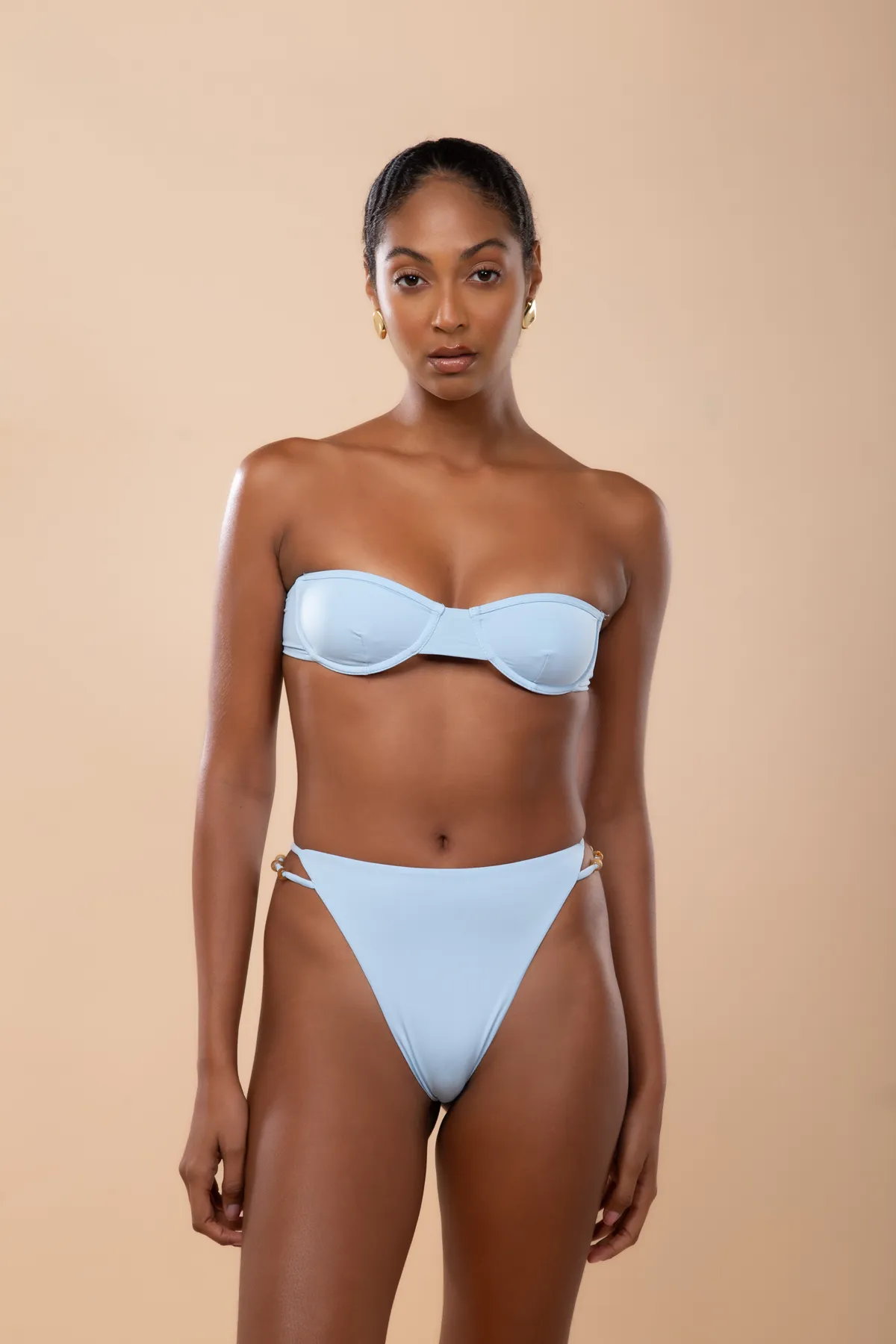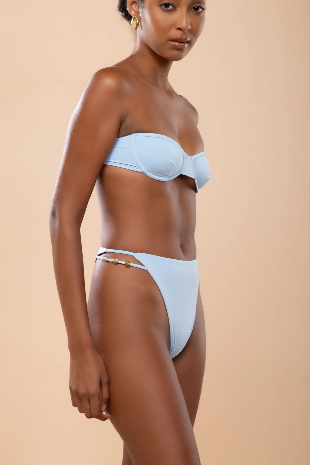 Calcinha hot pants, alta e cavada. Possui tiras laterais com miçangas.