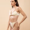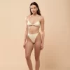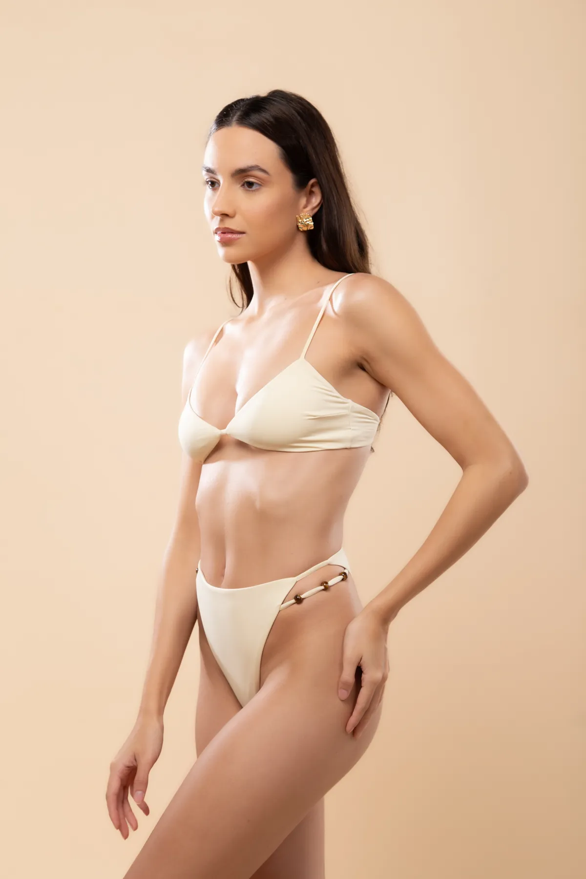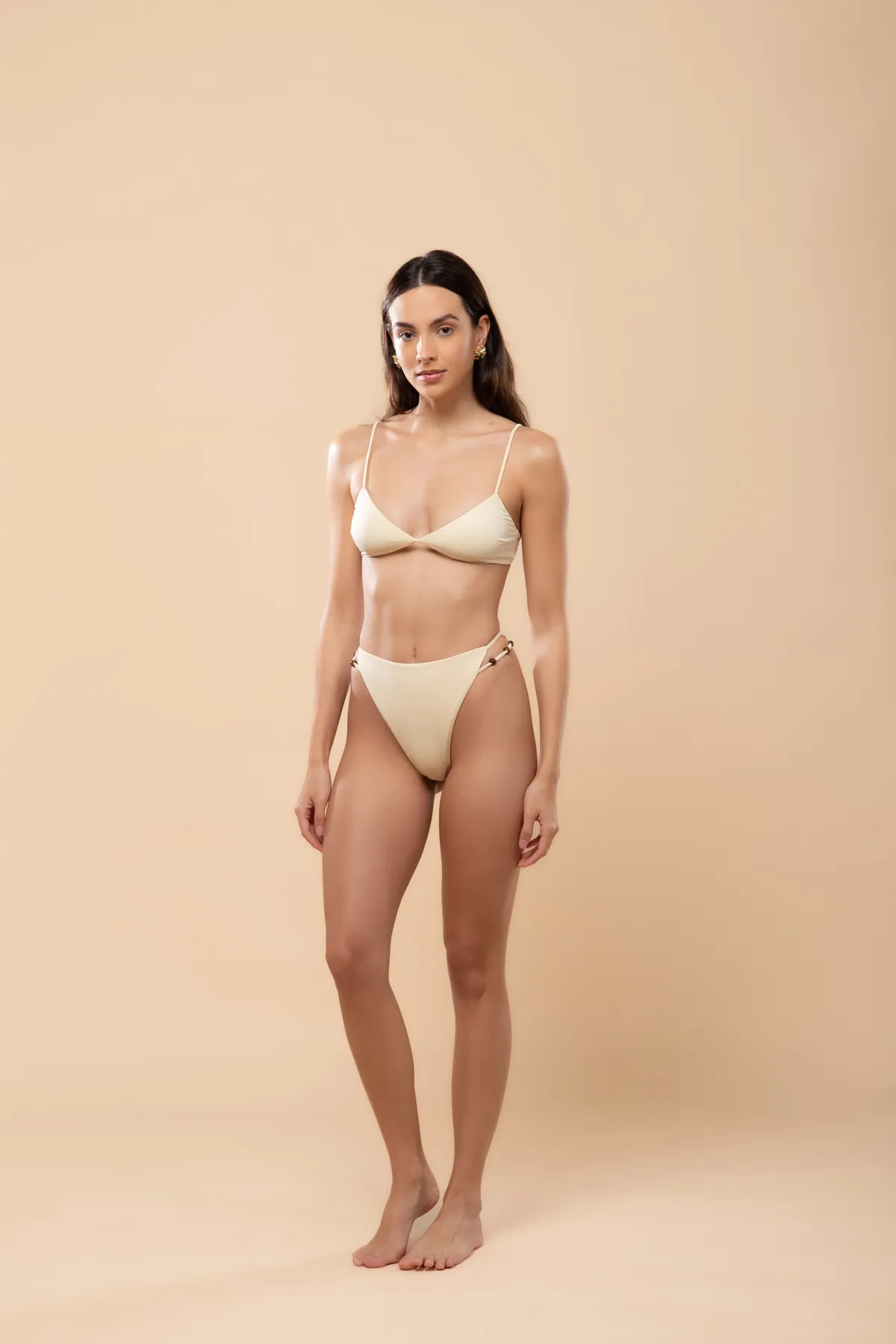 Calcinha hot pants, alta e cavada. Possui tiras laterais com miçangas.