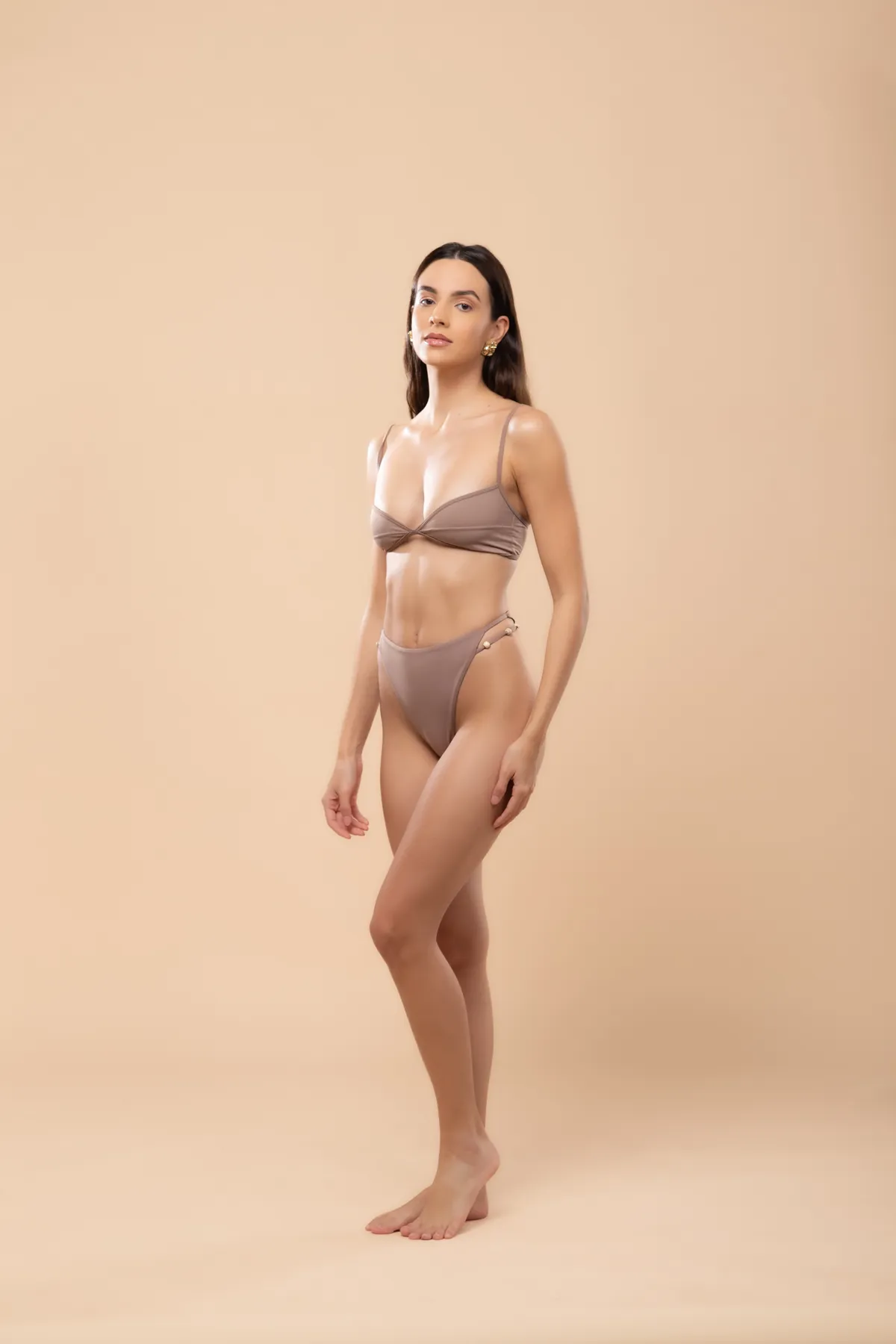 Calcinha hot pants, alta e cavada. Possui tiras laterais com miçangas.