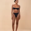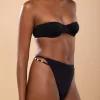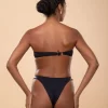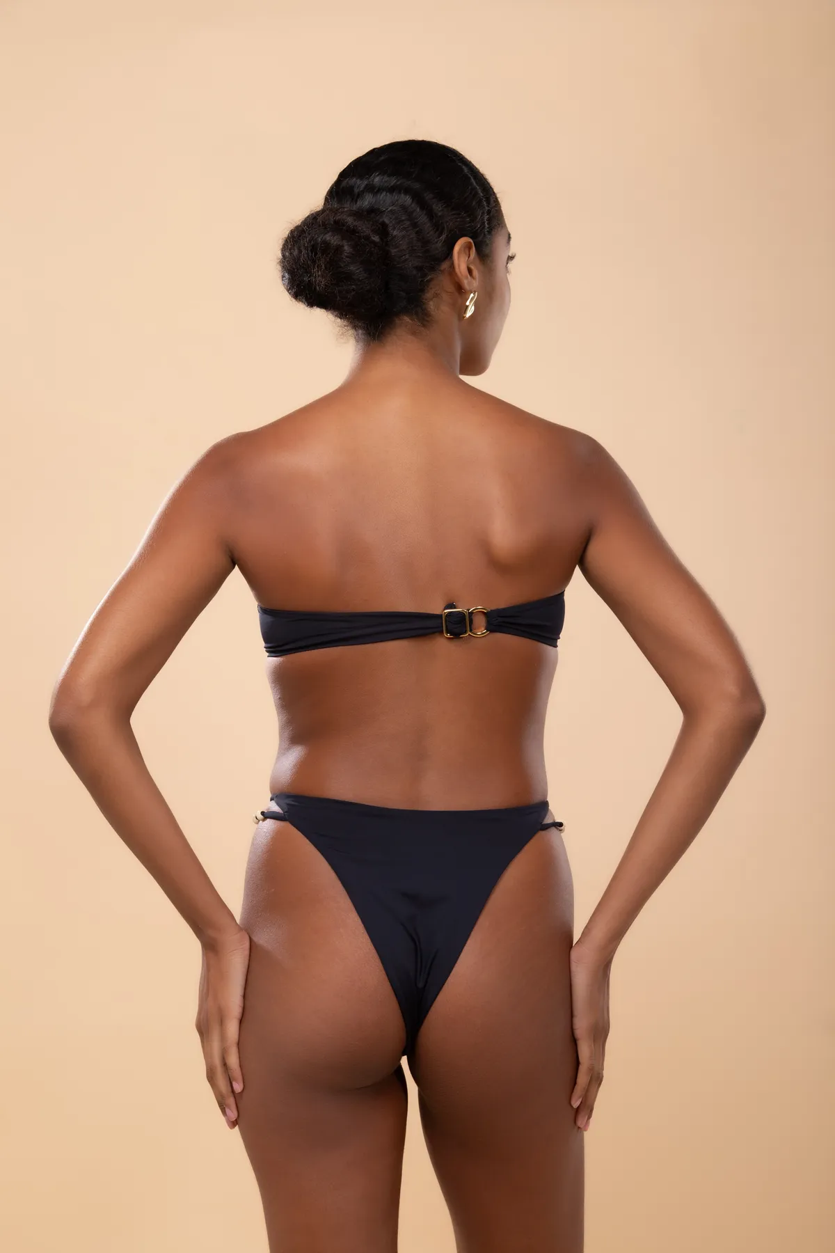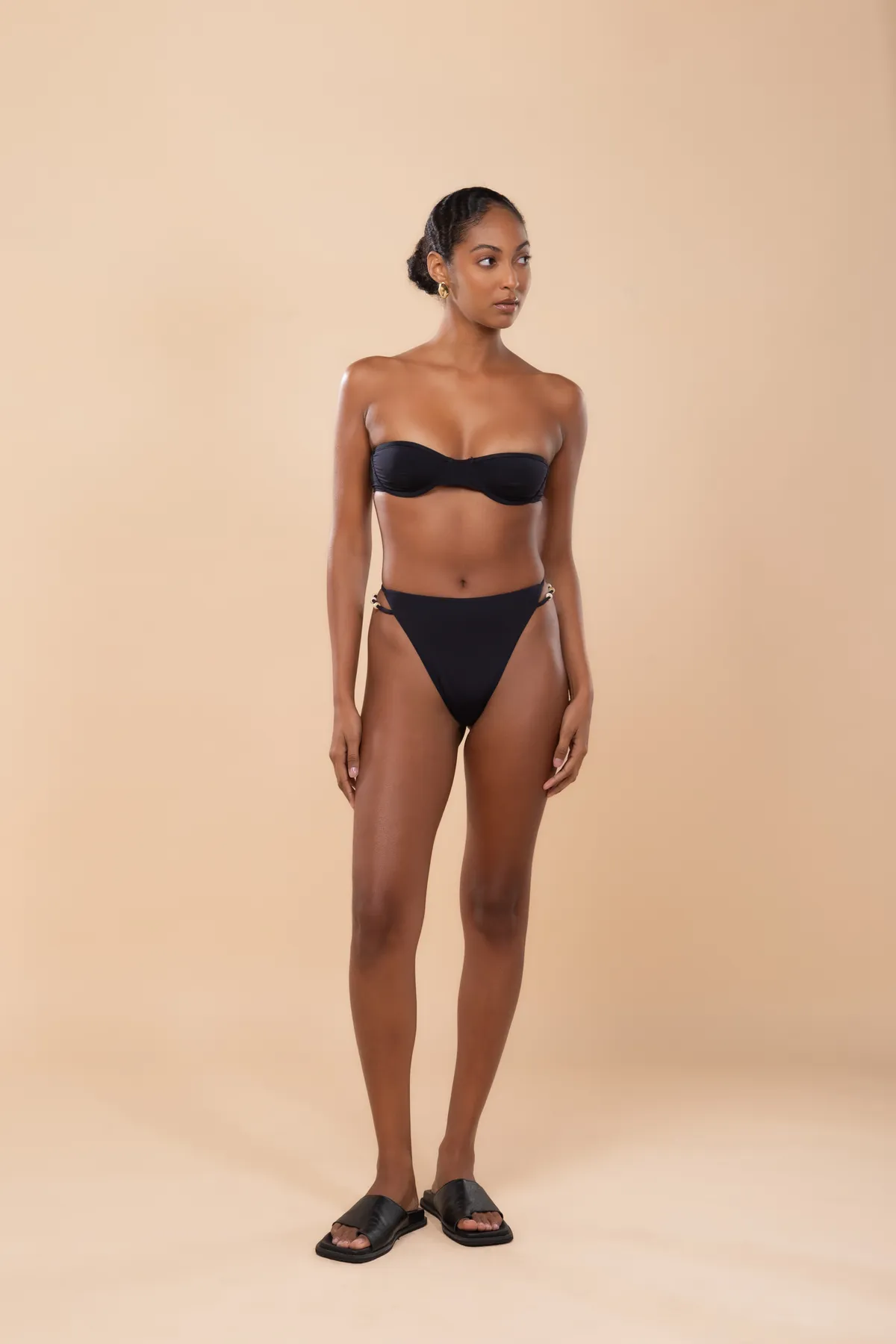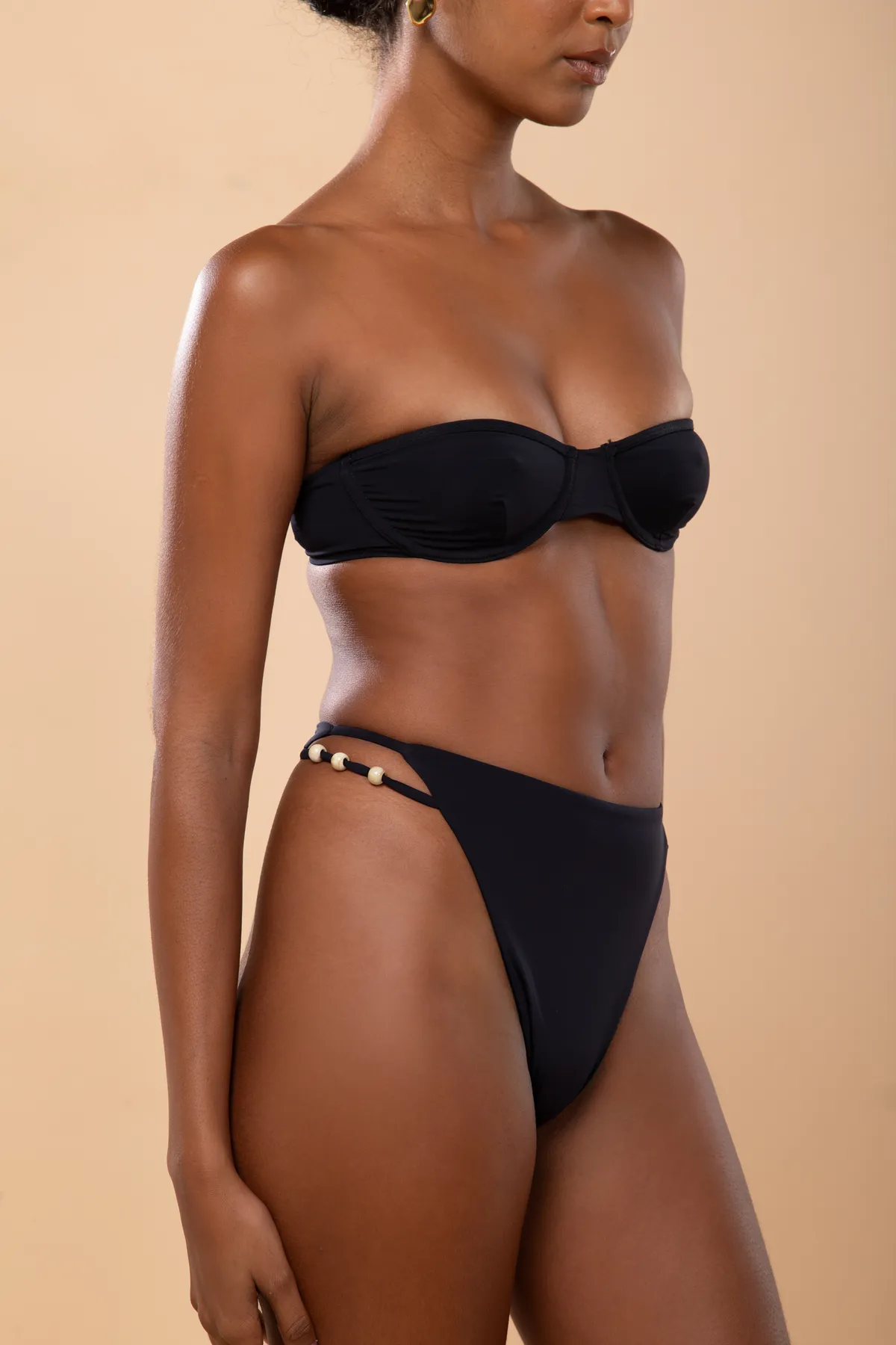 Calcinha hot pants, alta e cavada. Possui tiras laterais com miçangas.