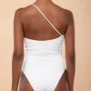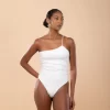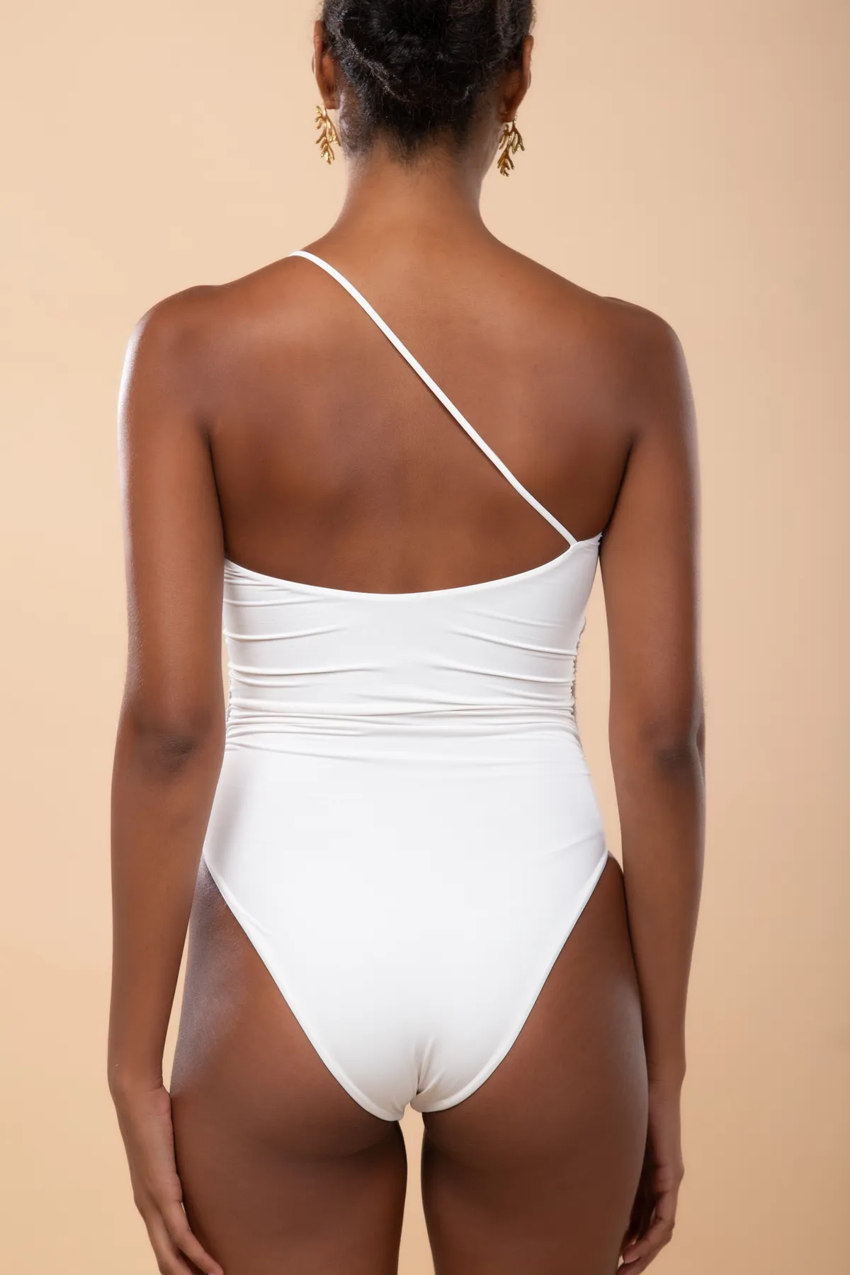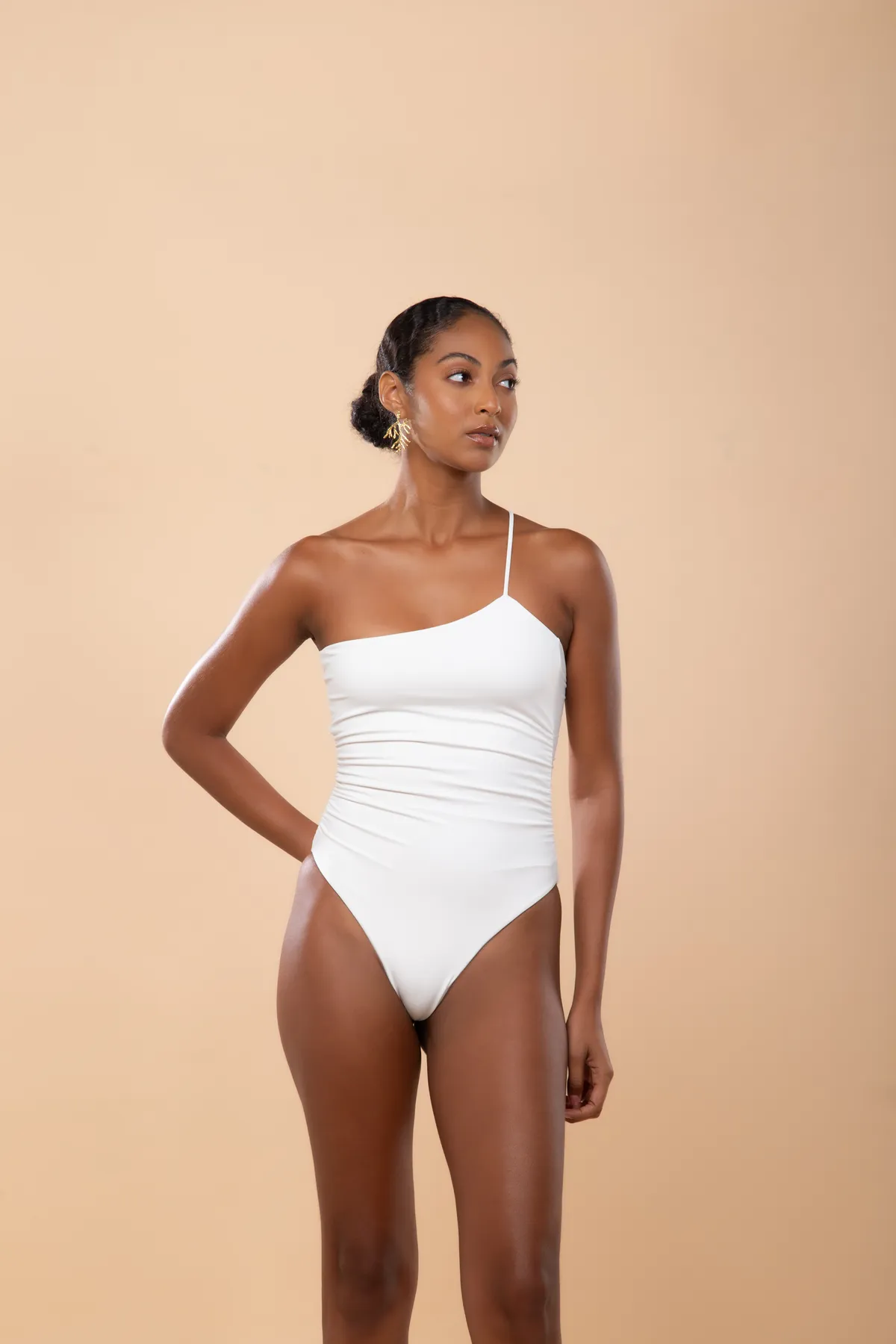 O Maiô Amanda é assimétrico, de um ombro só, e possui alça fina e minimalista que pode ser vestida atravessando o colo ou no ombro. Possui franzido nas laterais. Decote nas costas. Possui cavas médias.