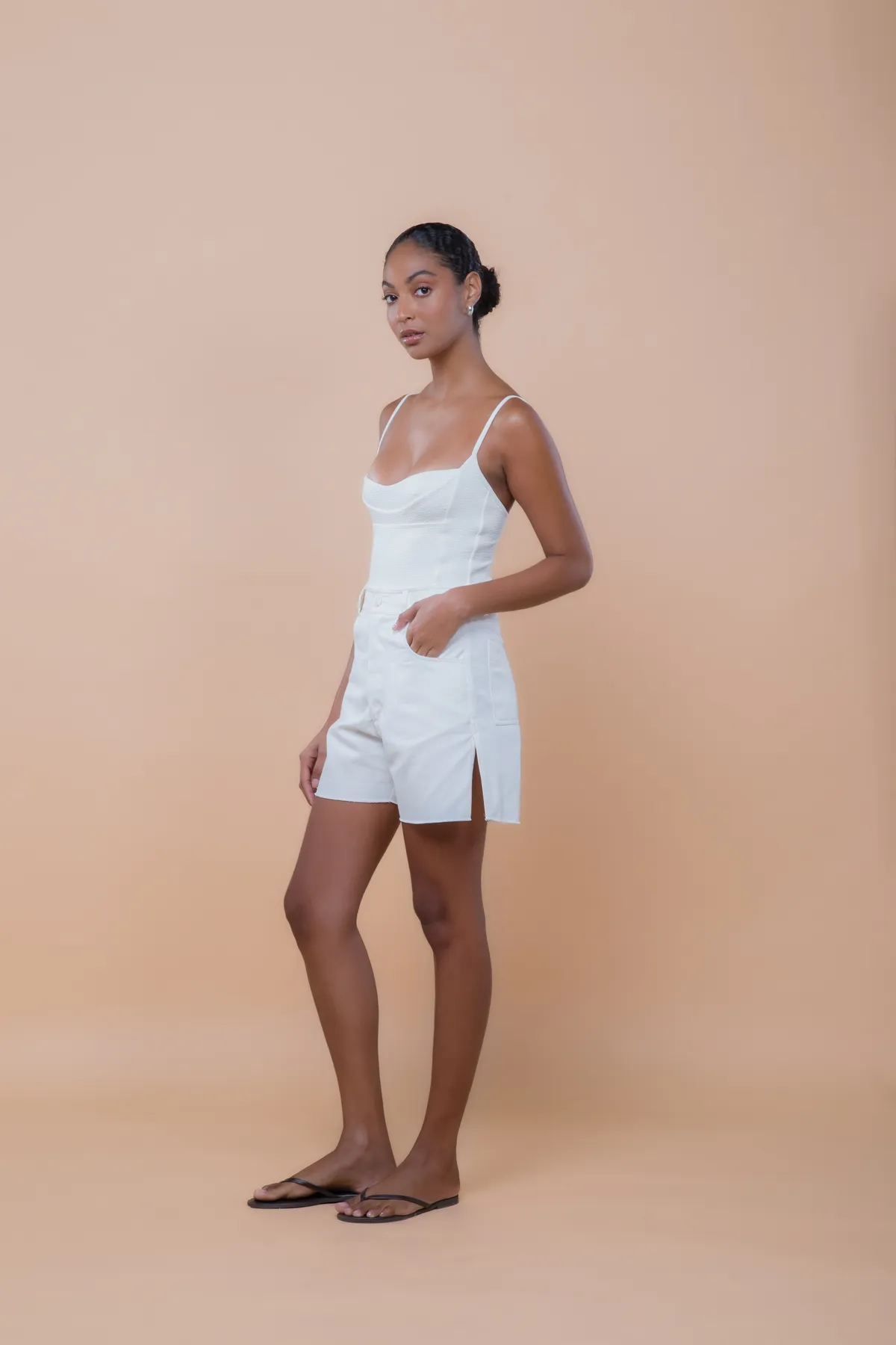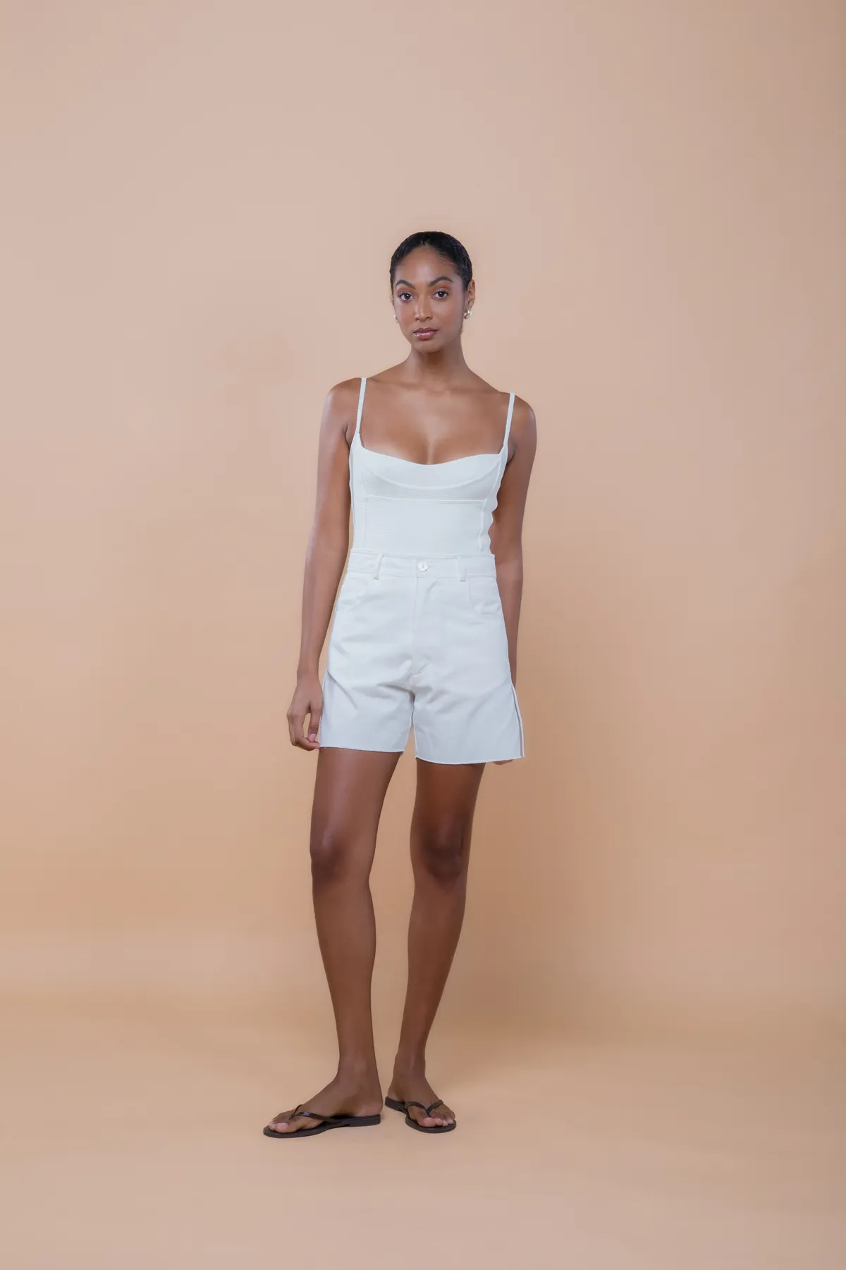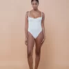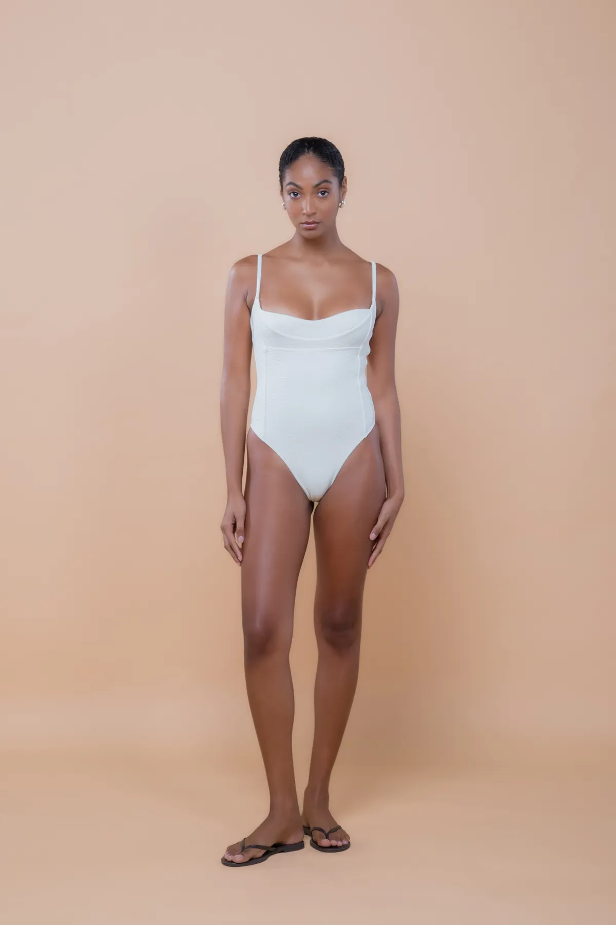 O Maiô Thais apresenta decote reto e cavado, com recortes estratégicos no busto e no tronco que valorizam e modelam a silhueta. Possui alças finas e paralelas em viés, com regulador em metal dourado banhado a ouro, e cavas acentuadas, combinando design contemporâneo, sofisticação e autenticidade. Feito em malha biodegradável com textura e forro leve.
