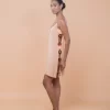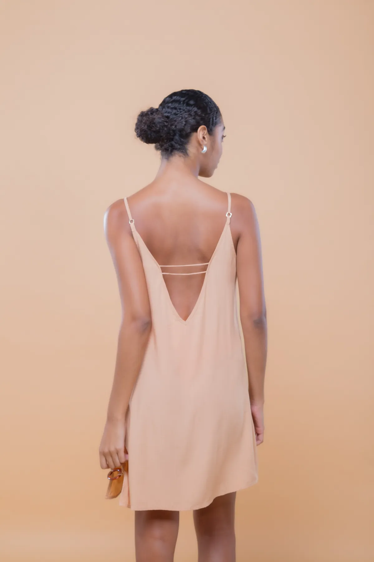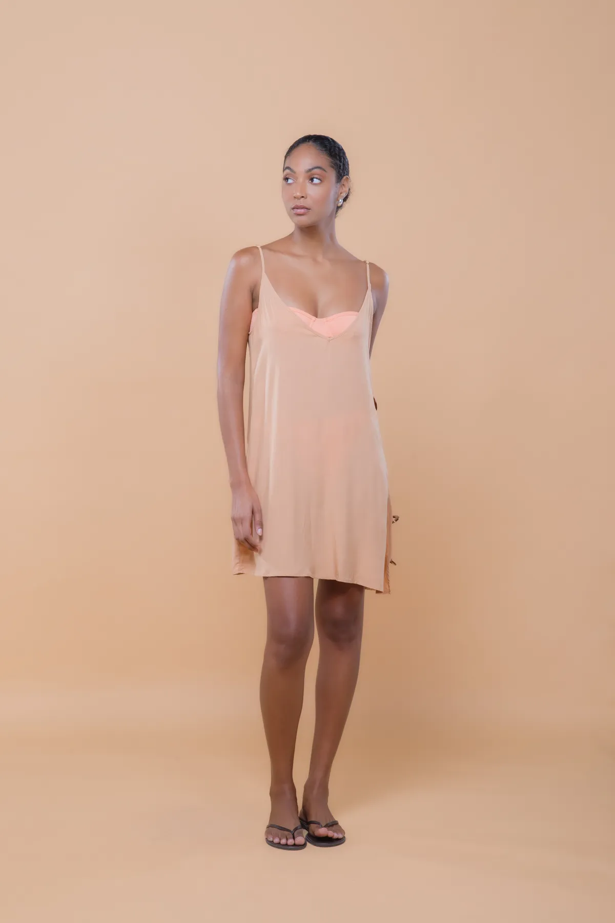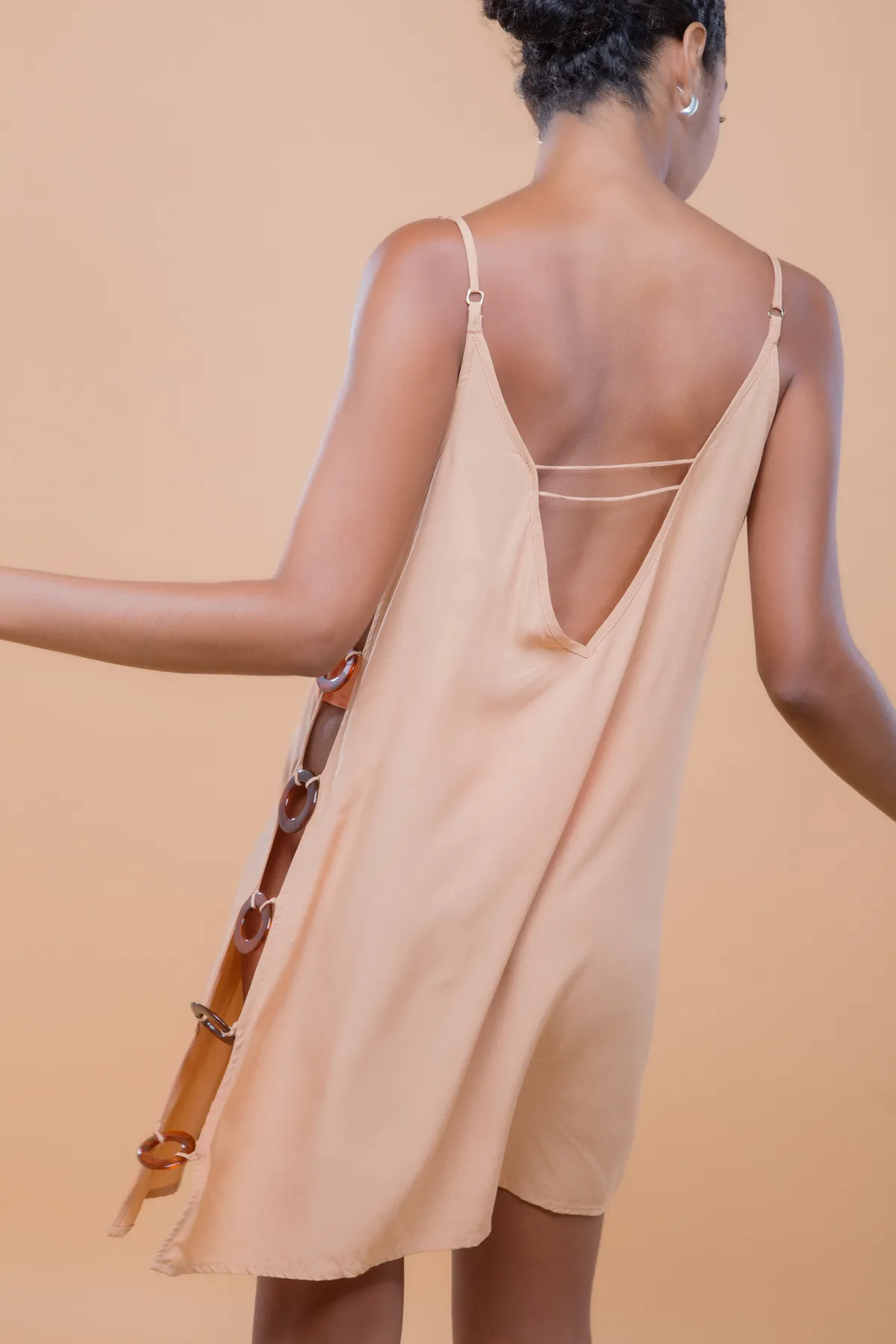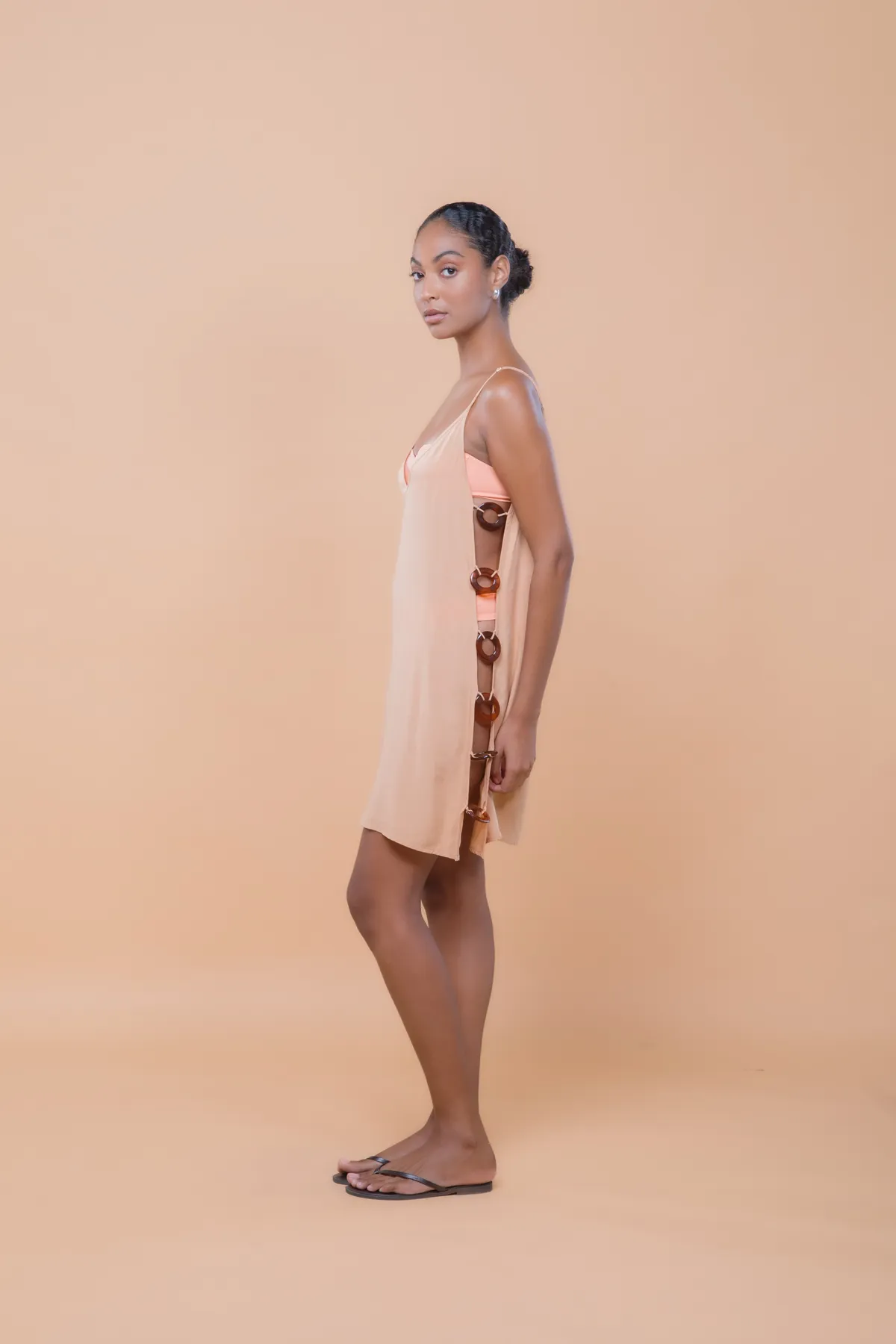 Saída de praia curta com design fluído e recorte lateral com acessório de argolas. Feita em crepe de viscose com leve transparência, uma peça leve e elegante para momentos à beira mar.