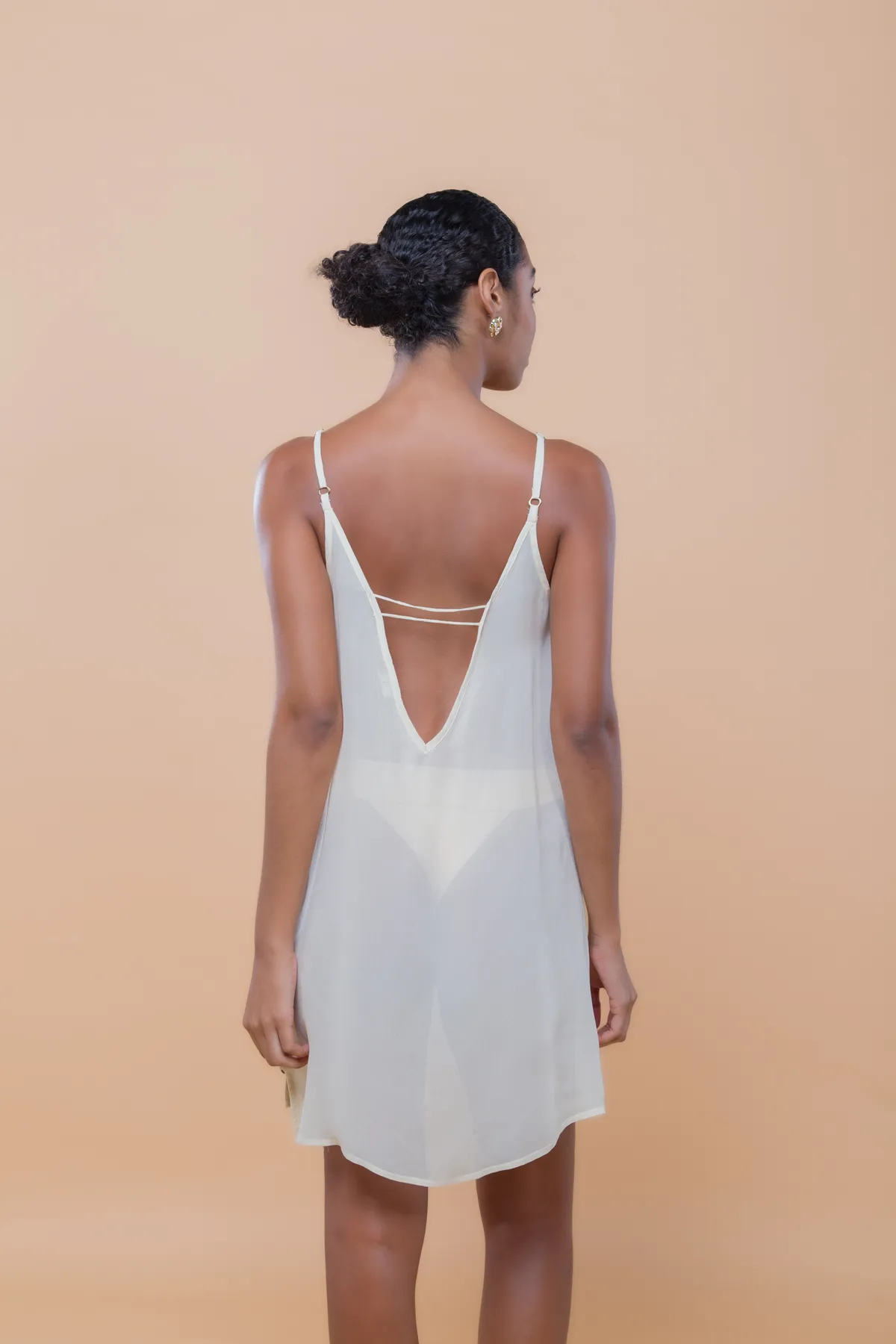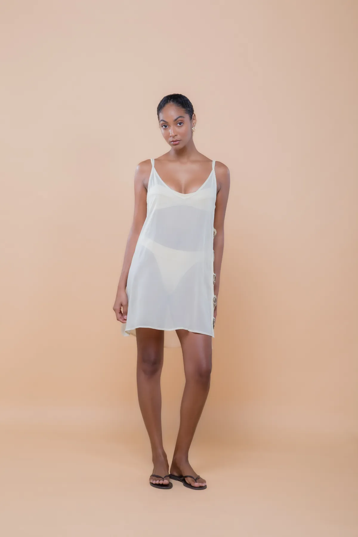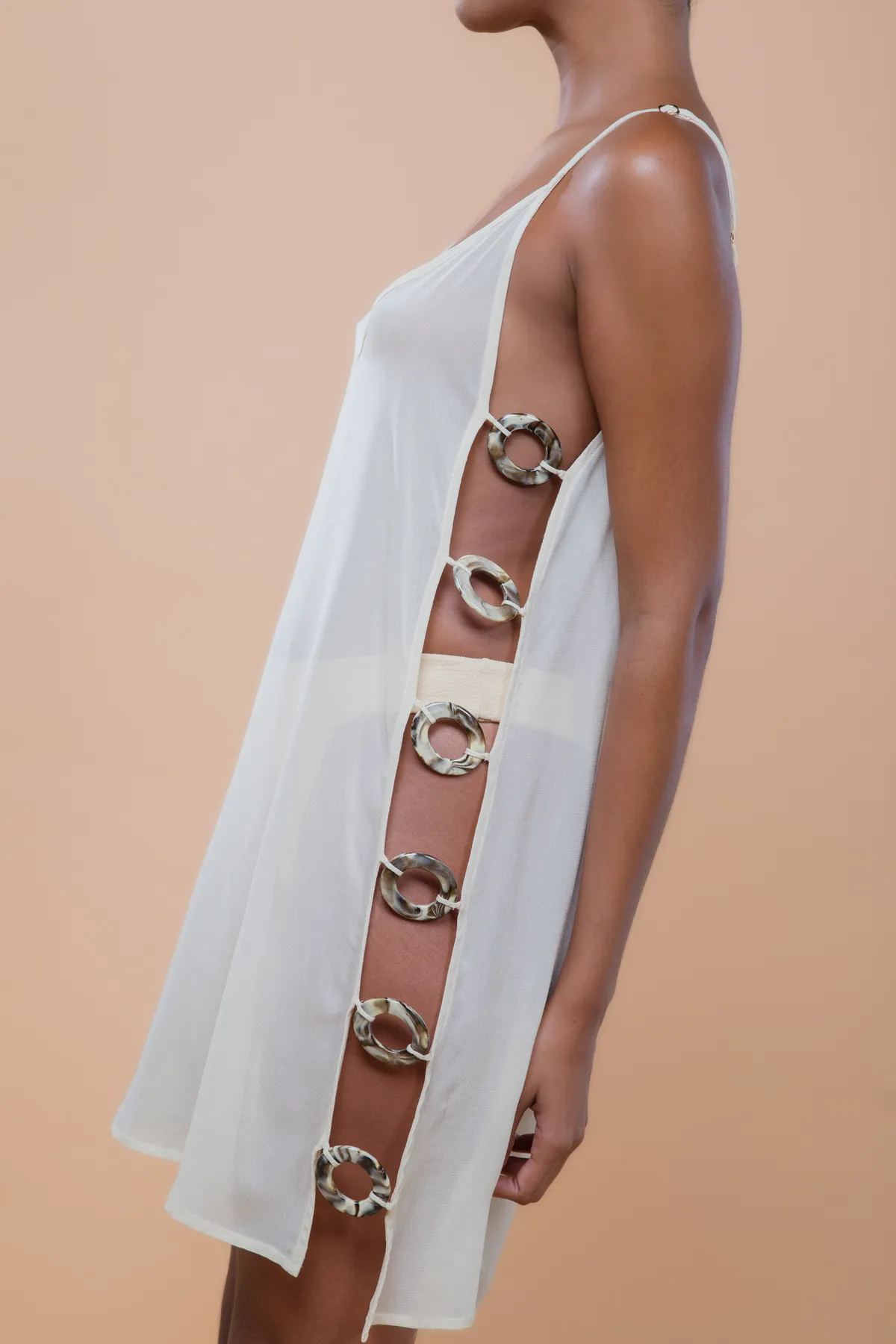 Saída de praia curta com design fluído e recorte lateral com acessório de argolas. Feita em crepe de viscose com leve transparência, uma peça leve e elegante para momentos à beira mar.