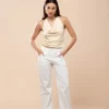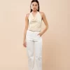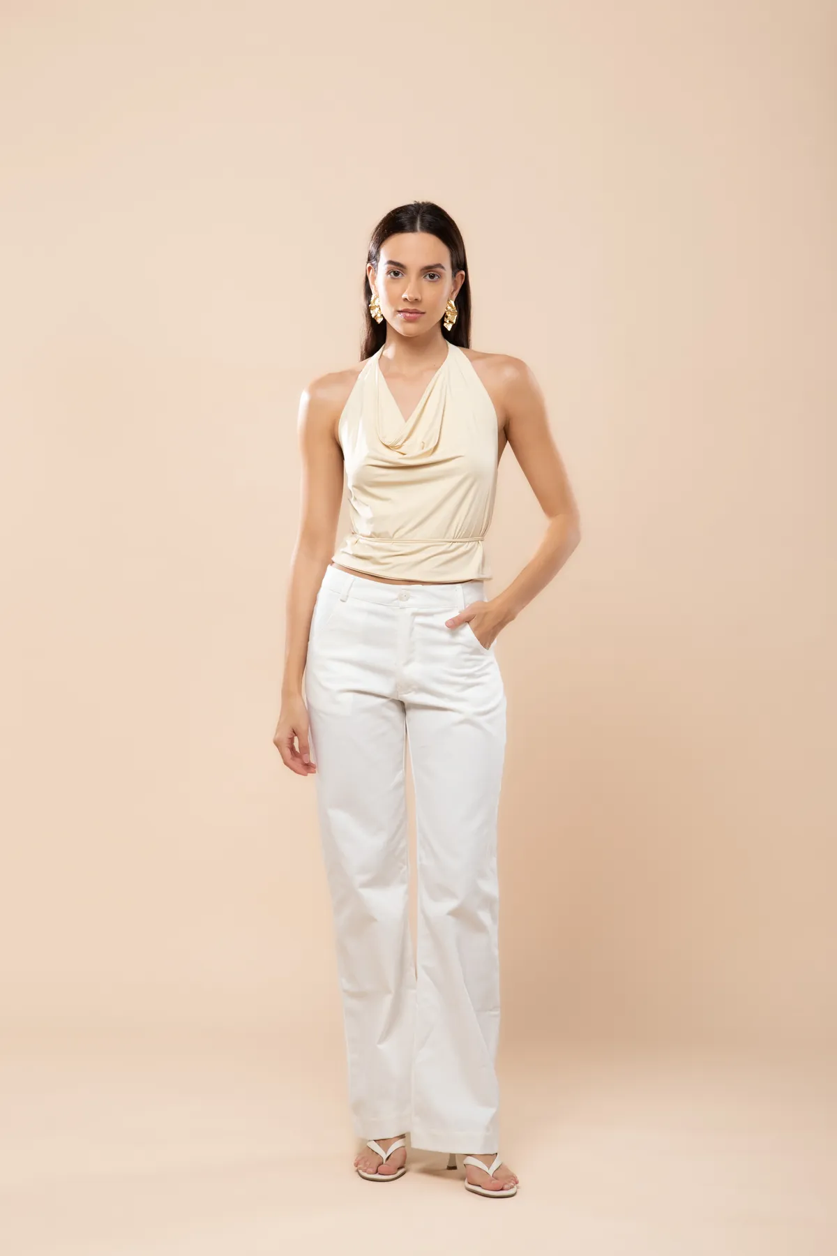 Top com decote degagé e fechamento de botões no pescoço. Possui amarração na cintura que pode ser transpassada pela frente acinturando a peça, ou amarrada somente nas costas para deixar o top solto.
