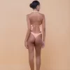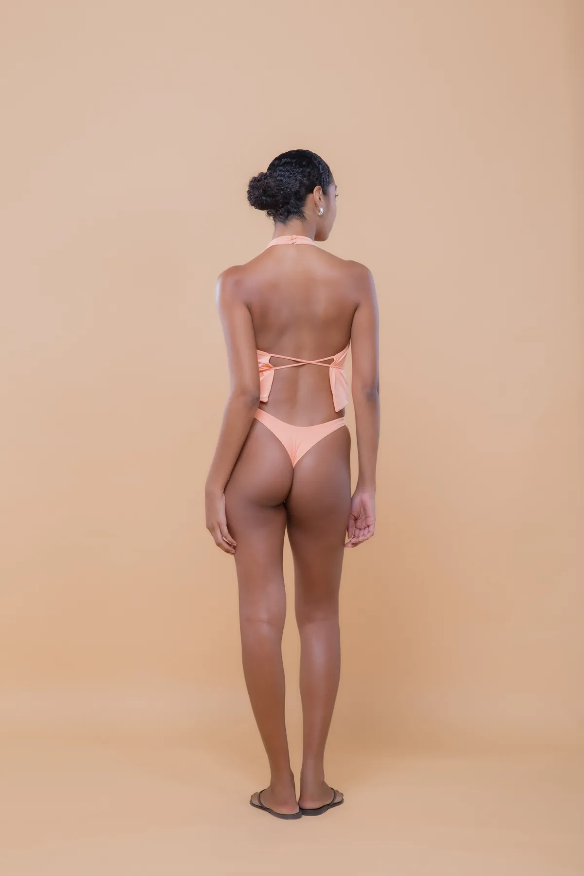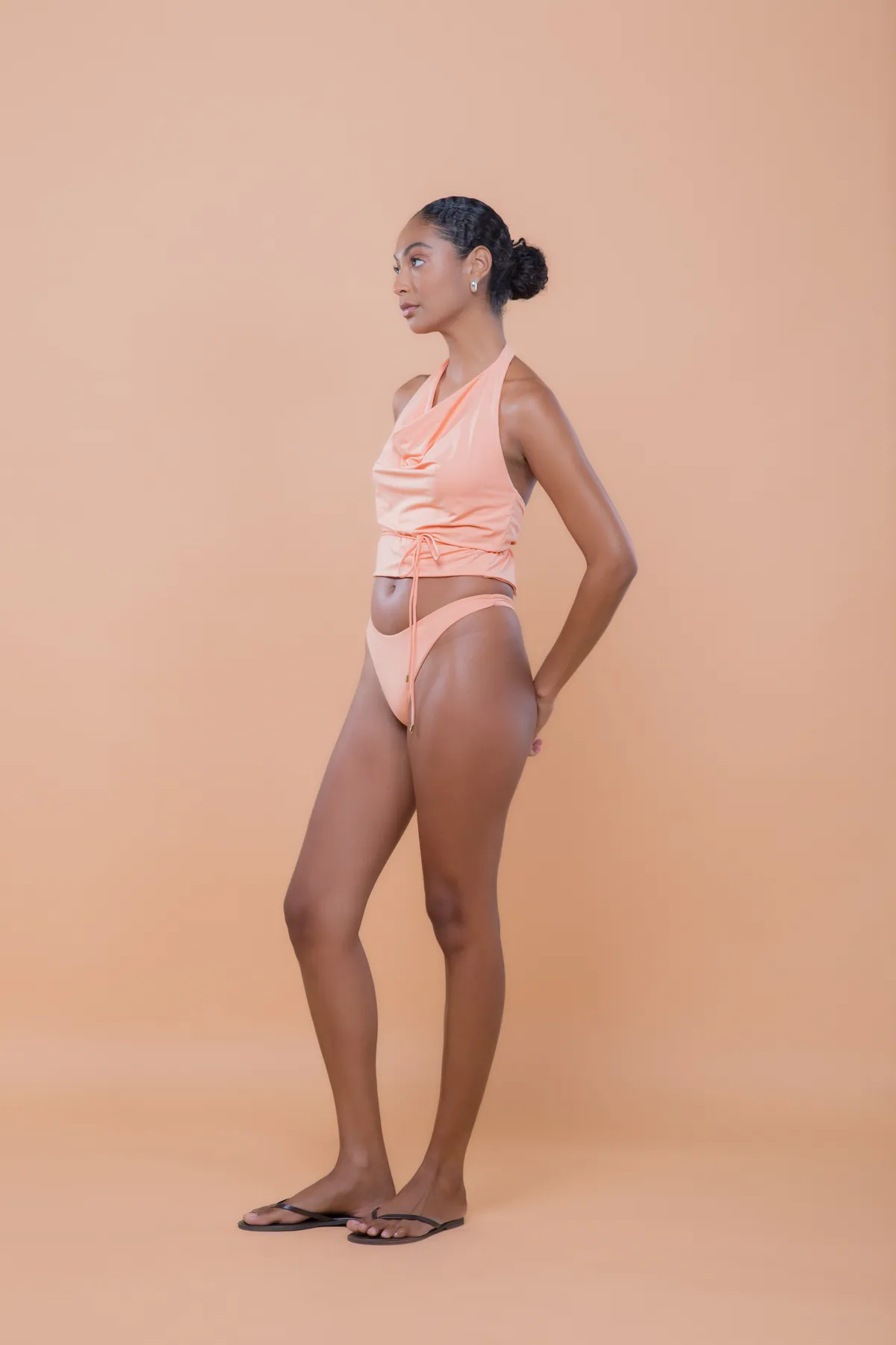 Top com decote dégagé e fechamento de botões no pescoço. Possui amarração na cintura que pode ser transpassada pela frente acinturando a peça, ou amarrada somente nas costas para deixar o top solto.