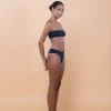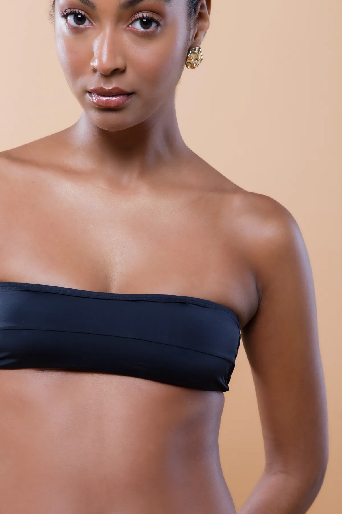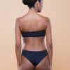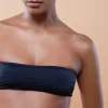 Top tomara que caia com viés no elástico superior e recorte no centro.