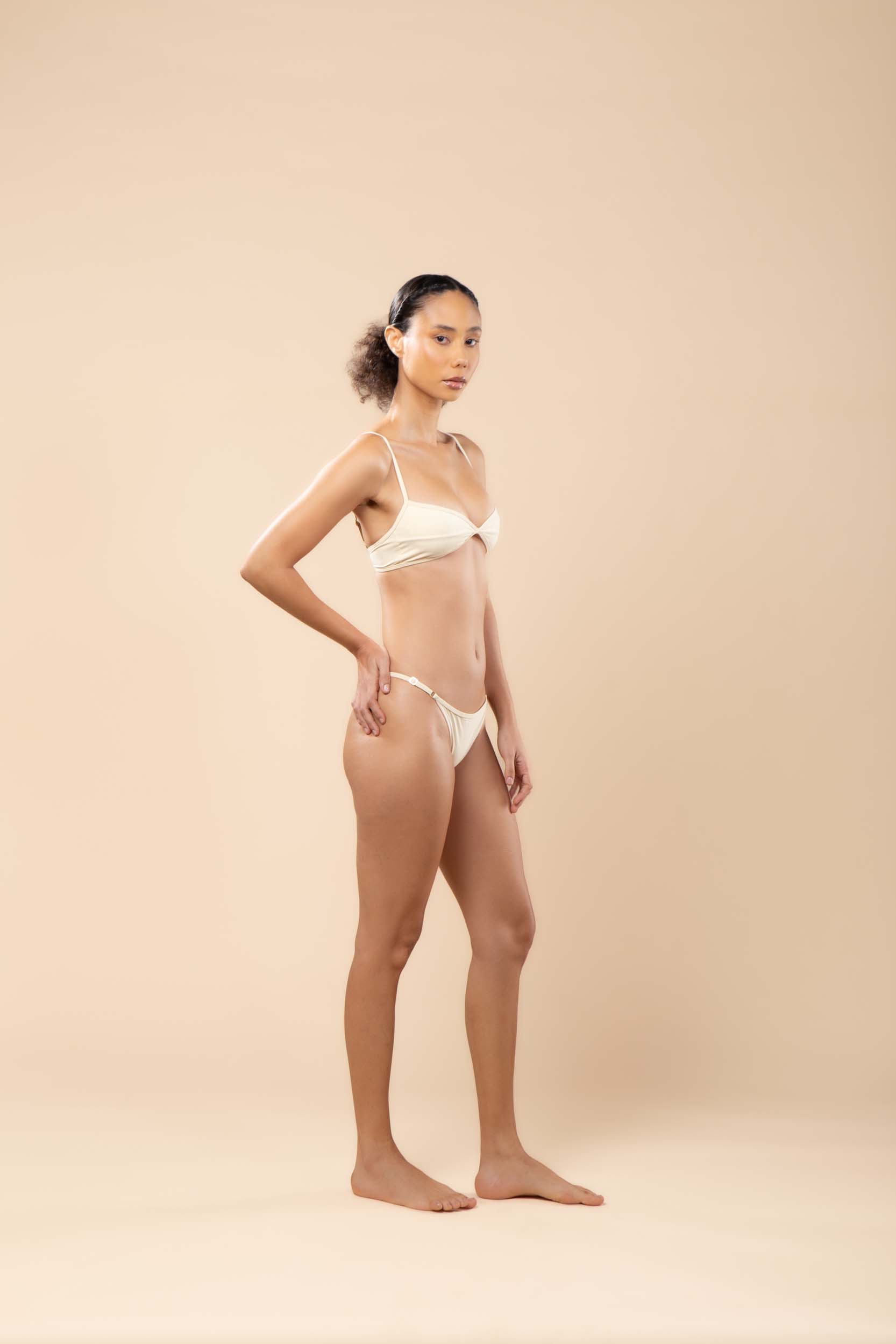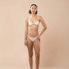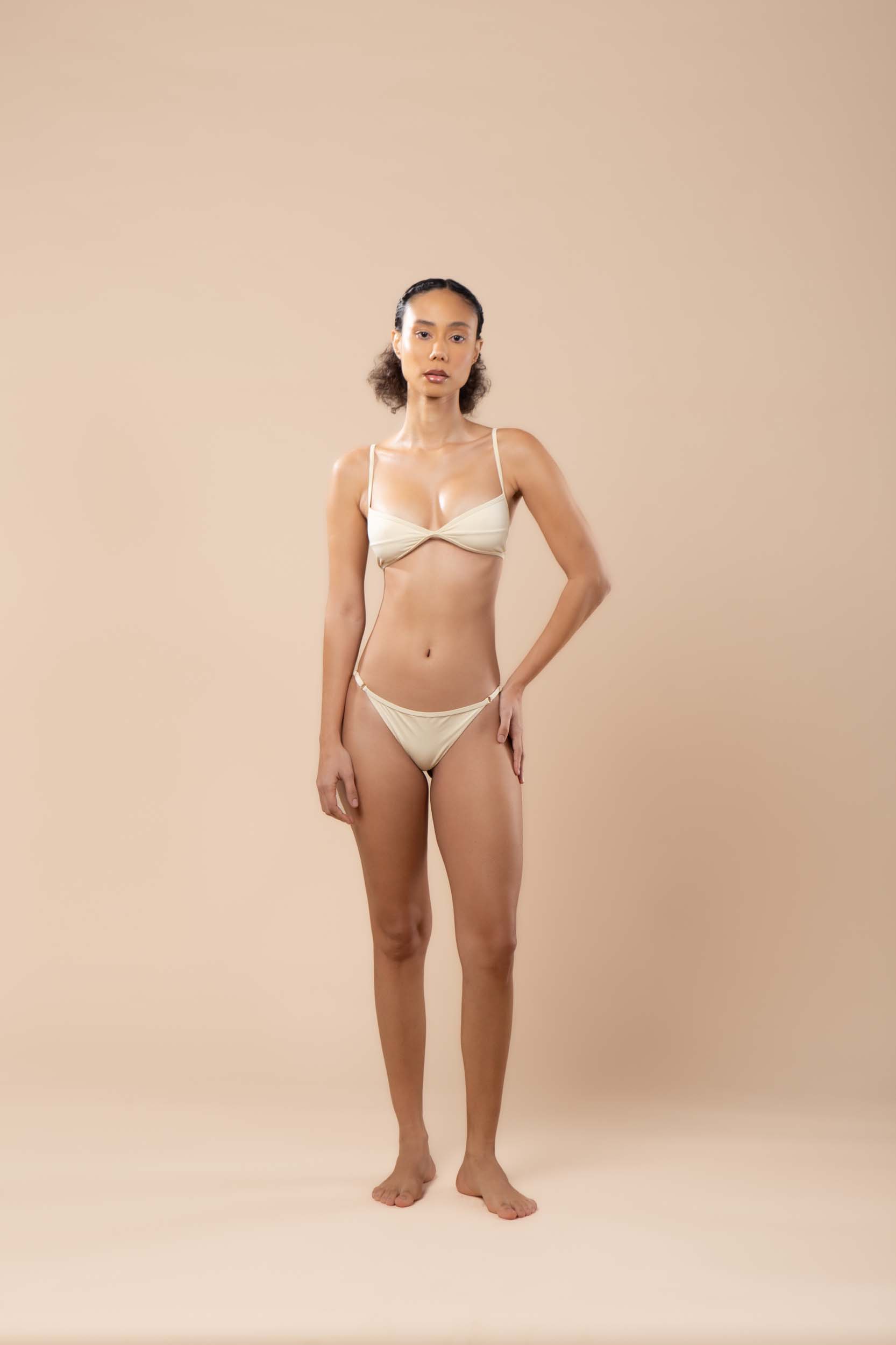 Top com decote acentuado, modelagem vintage, com viés. Recorte horizontal no busto. Alças finas, em viés, com regulagem. Fecho em metal dourado nas costas. Não possui bojo. Tecido em dupla camada. Sustentação e conforto para os dias ensolarados.