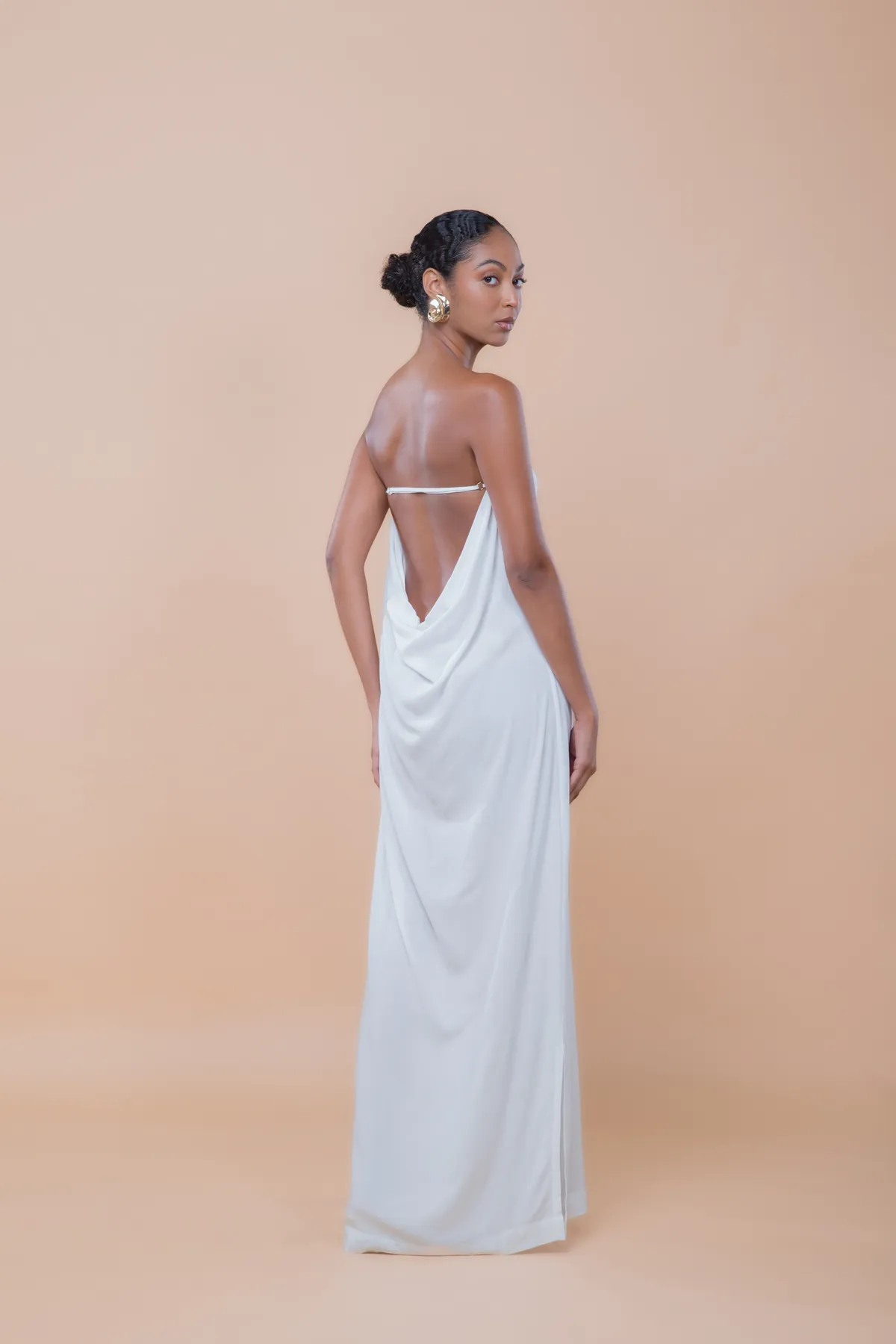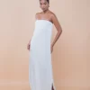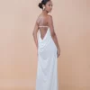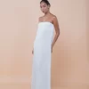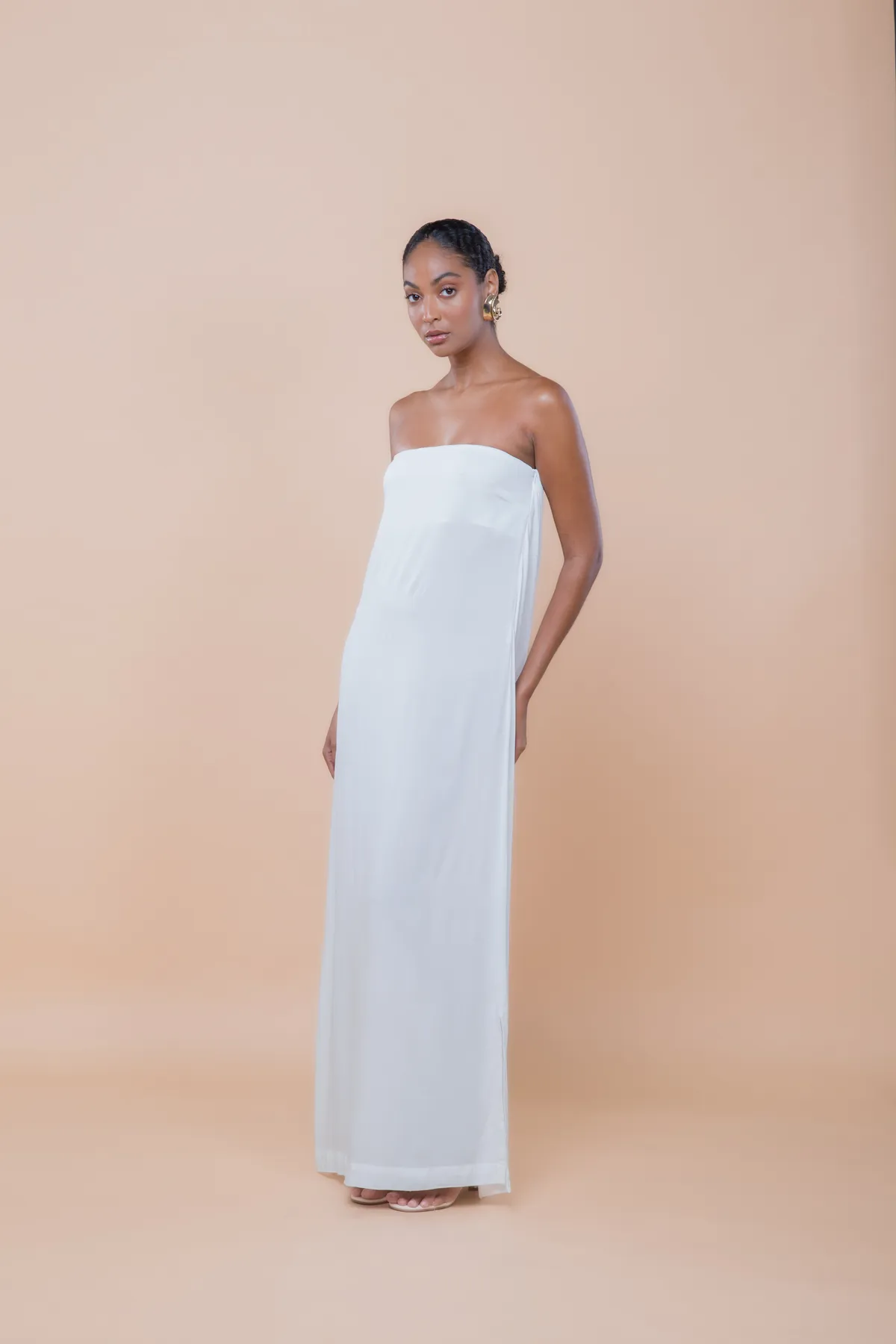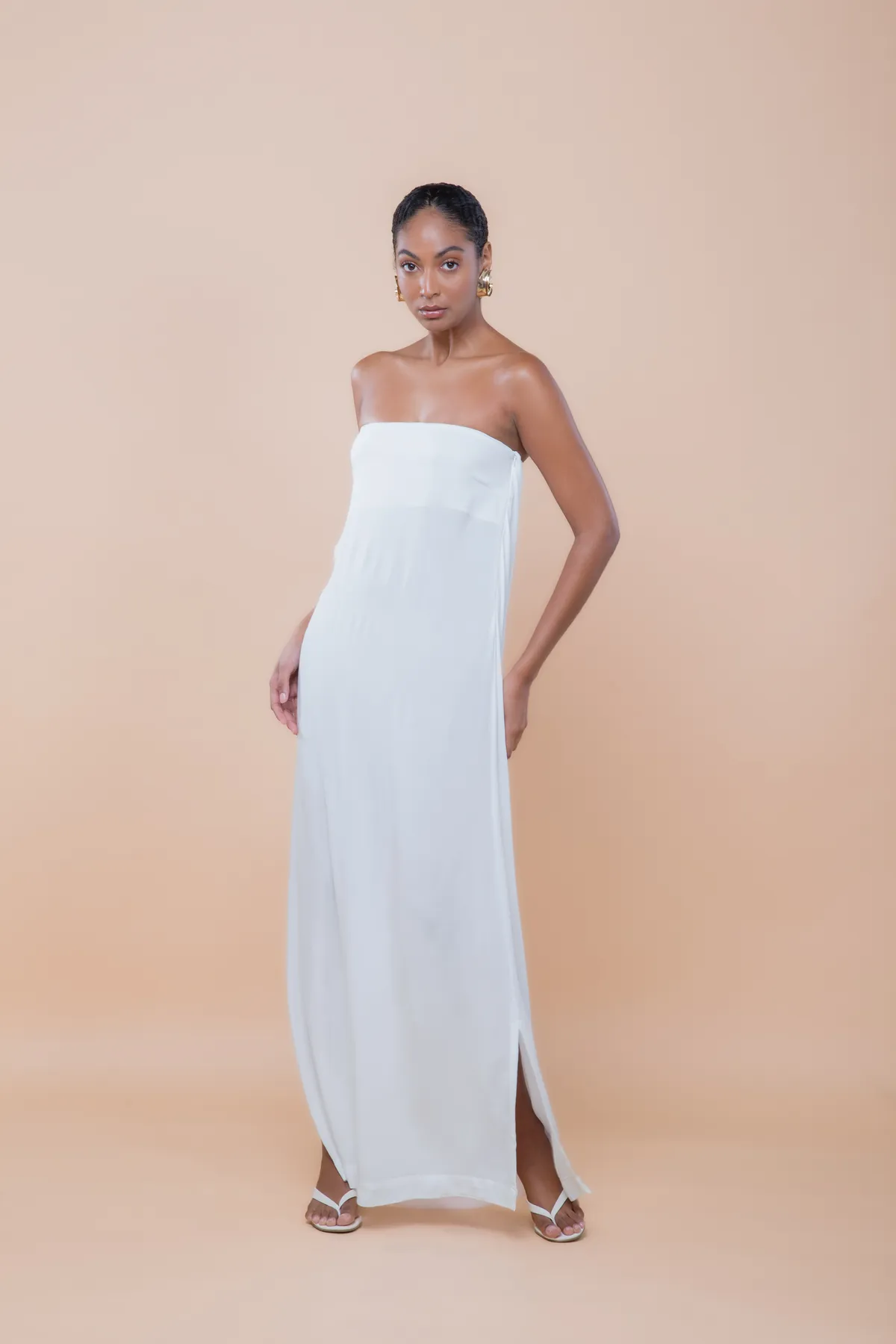 Vestido longo tomara que caia, com fendas laterais e um decote amplo em degagê nas costas. Possui regulagem nas costas para um ajuste perfeito. Feito em crepe de viscose, oferece caimento leve, movimento sutil e toque sofisticado.