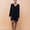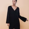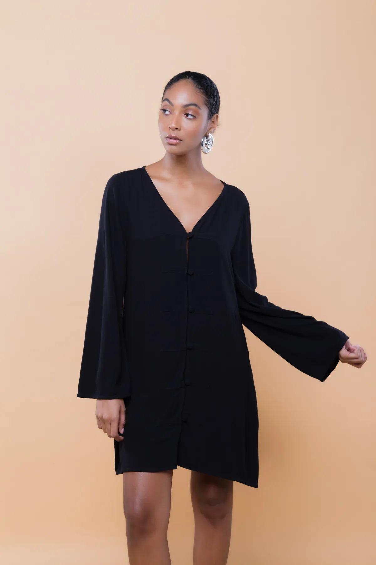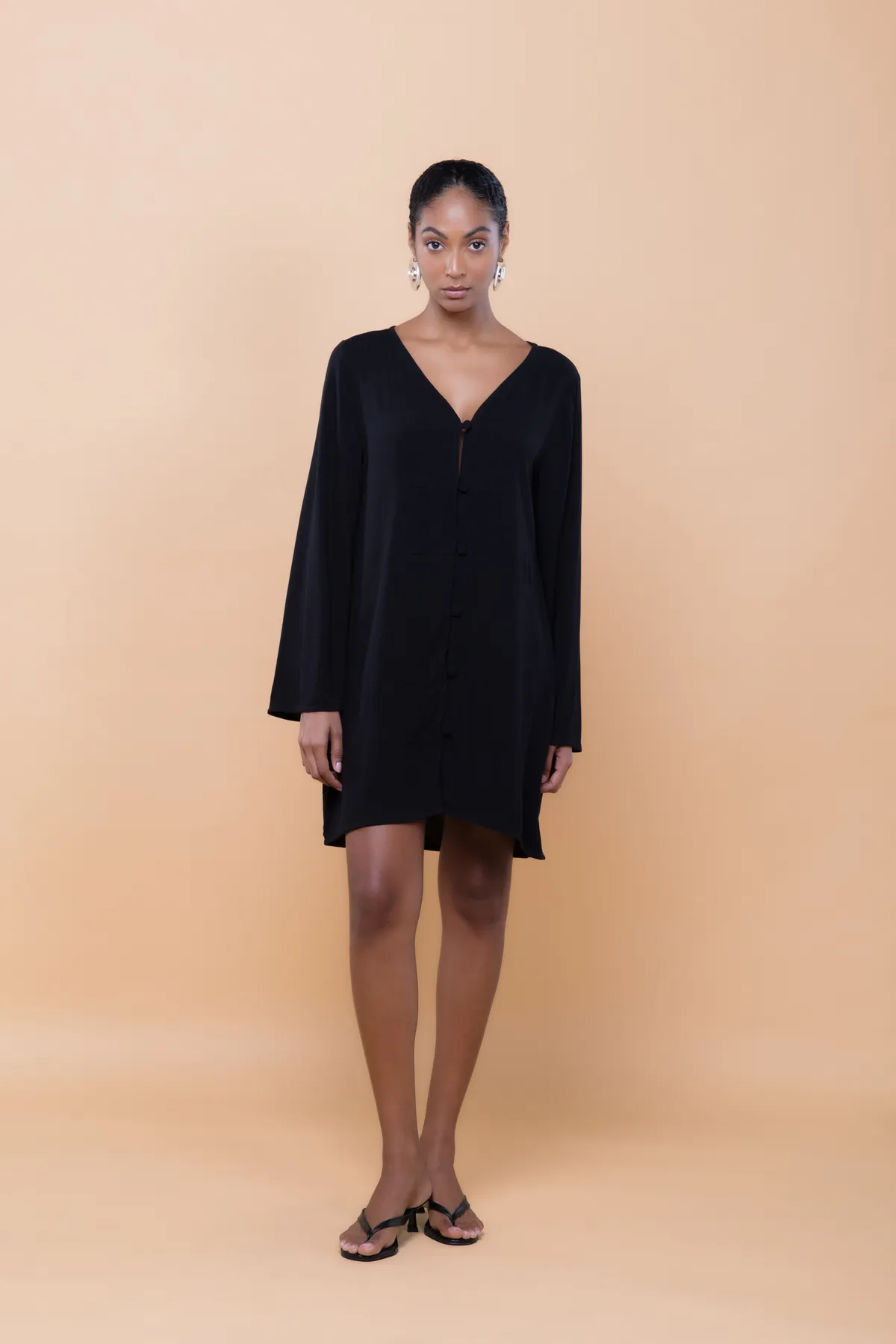 Vestido curto com botões, decote em V e mangas longas. Versátil, transita com facilidade entre diferentes ocasiões: do pós-praia, sobre biquíni ou maiô, até eventos noturnos com elegância descomplicada. Feito em crepe de viscose, oferece caimento leve e movimento sutil.