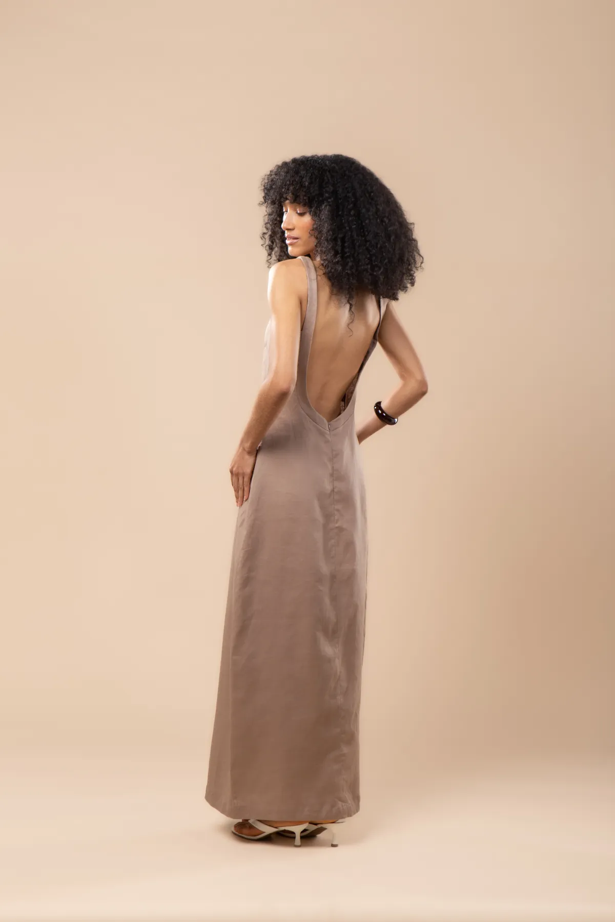 O Vestido Rita é longo, feito 100% em linho, unindo modernidade e conforto de forma natural. Modelagem longa e fluída, com decote aberto nas costas que proporciona todo o charme da peça. Fechamento em zíper invisível na parte de trás.